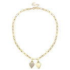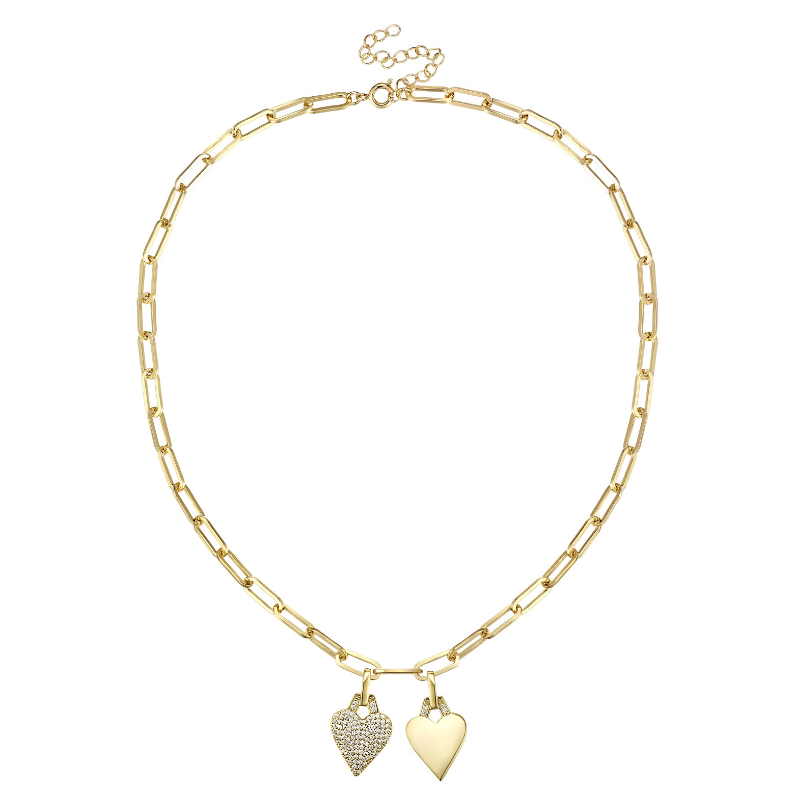 Double heart pendants tell a tale of romance and love, making this chic necklace a great gift to give your beloved or any close one. A sparkling cubic zirconia encrusted heart sits next to a shiny heart, all in 14k yellow gold plated sterling silver. A chunky cable chain adds a luxe appeal, secured by a spring ring clasp and extension chain.