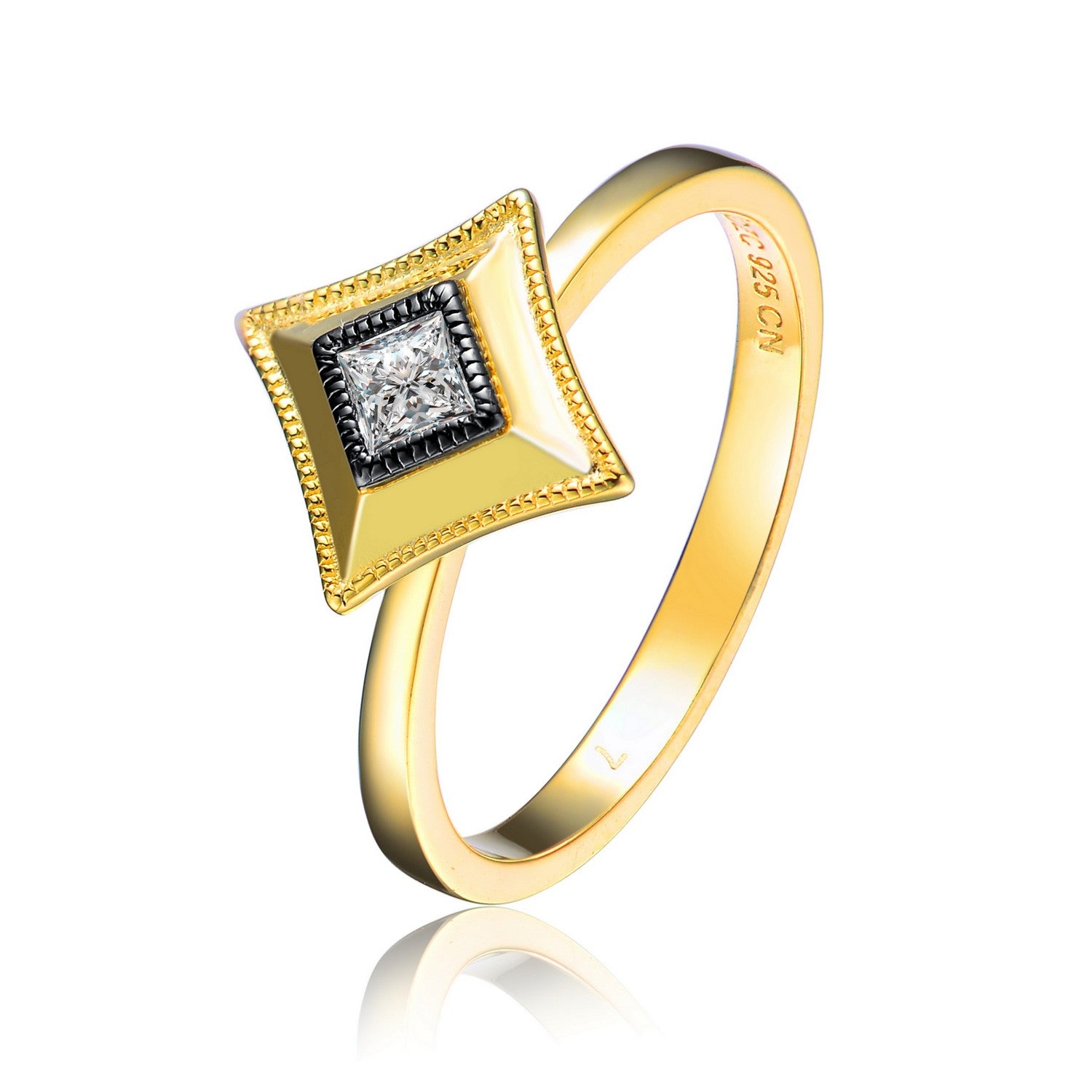 Modern.925 Sterling silver black and gold plated cubic zirconia solitaire ring. This ring features large clear radiant cubic zirconia stone set in decorative black plated prong setting, within a gold plated square shape. Crafted of .925 Sterling silver with gold and black plating and it is available in sizes 6, 7, 8.