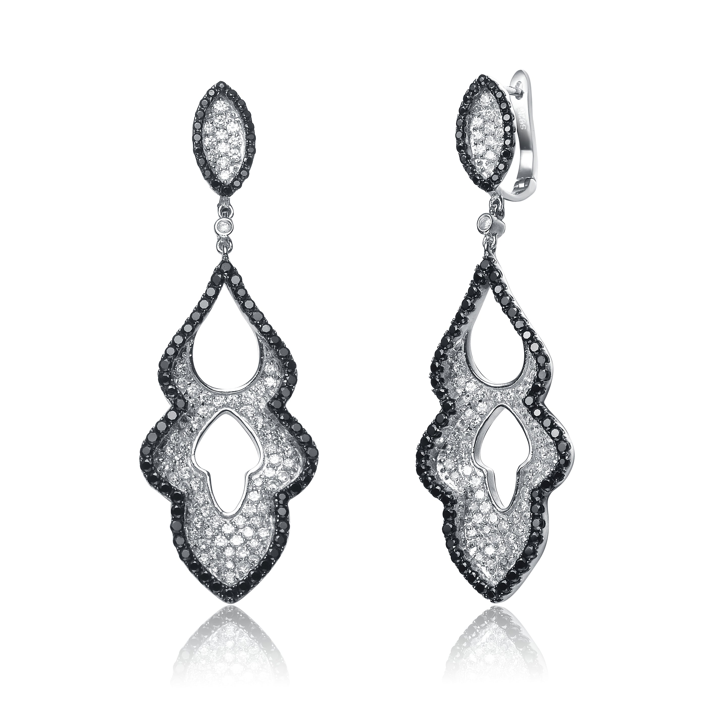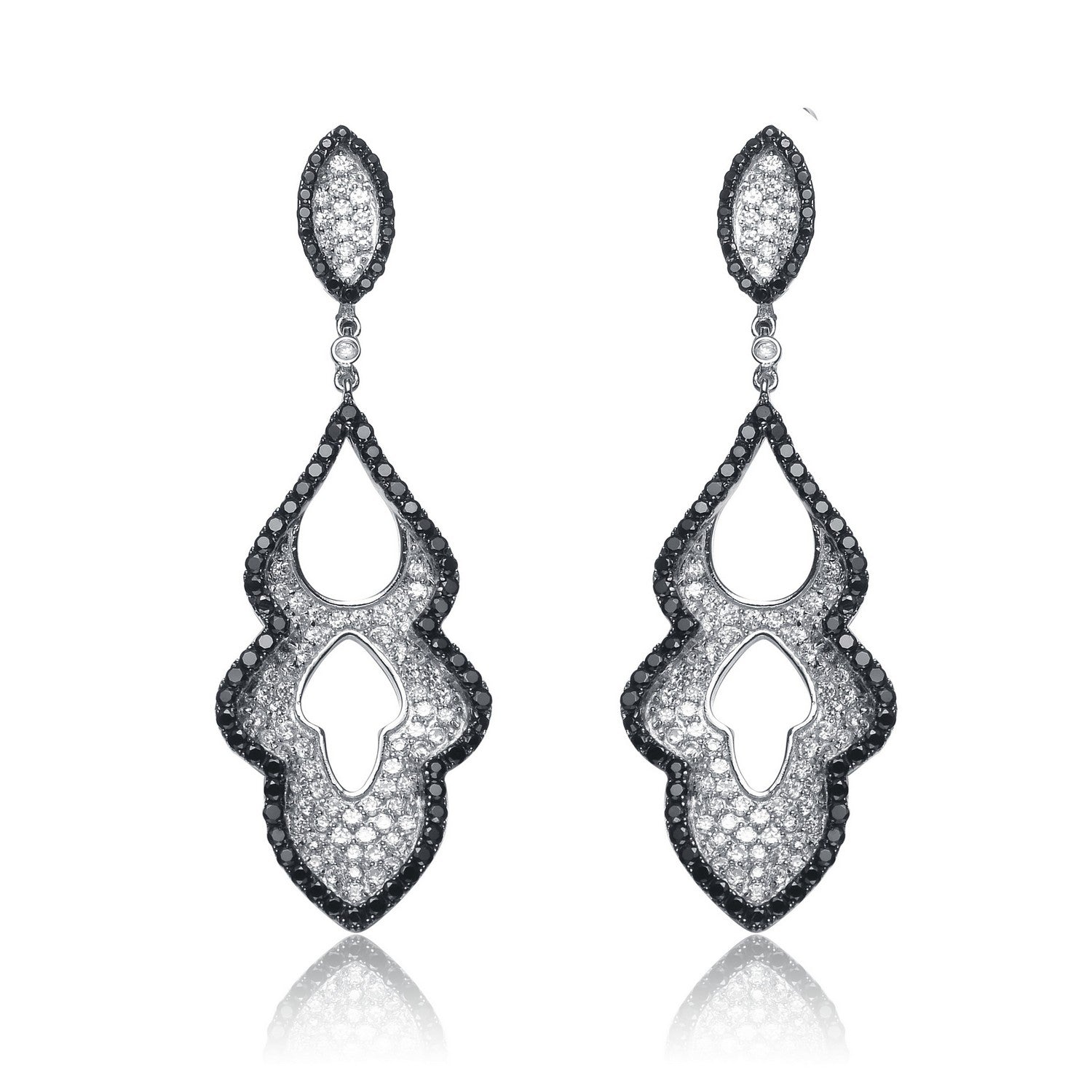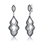 Stylish .925 Sterling silver black plated cubic zirconia dangling earrings. These fancy dangling earrings are decorated with black and clear round cut cubic zirconia stones in prong setting. Crafted of .925 Sterling silver in rhodium and black plating and secure with butterfly clasps.