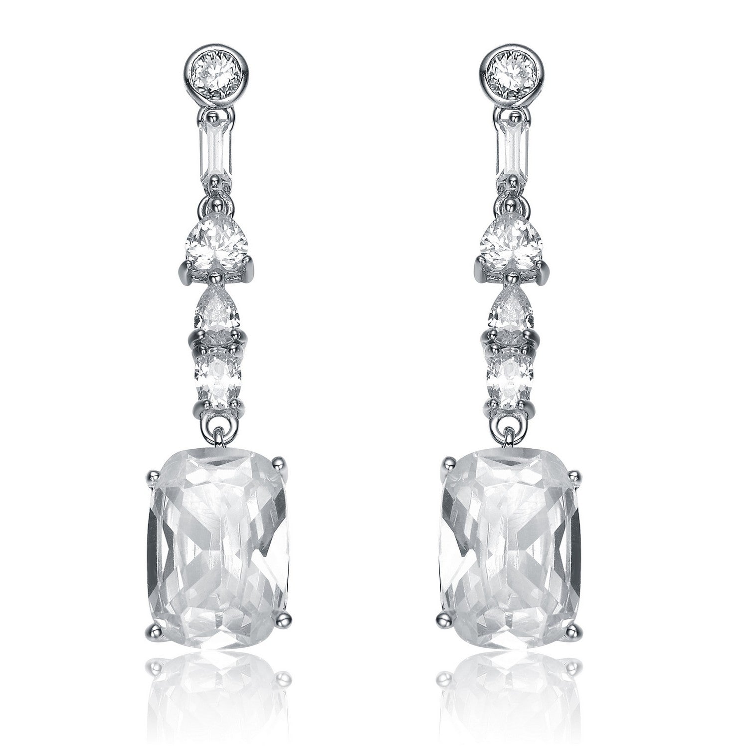 Stylish .925 Sterling silver cubic zirconia dangle earrings. These earrings feature a trail of clear cubic zirconia stones finished off by a clear radiant cubic zirconia solitaire. Crafted of .925 Sterling silver in rhodium plating and secure with butterfly closure.