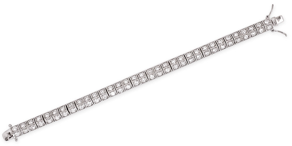 Classy .925 Sterling silver tennis bracelet. This bracelet's design features clear round cubic zirconia stones set in square shaped elements in two rows. Crafted of .925 Sterling silver and it is secured with box clasp. Makes a great gift as well.