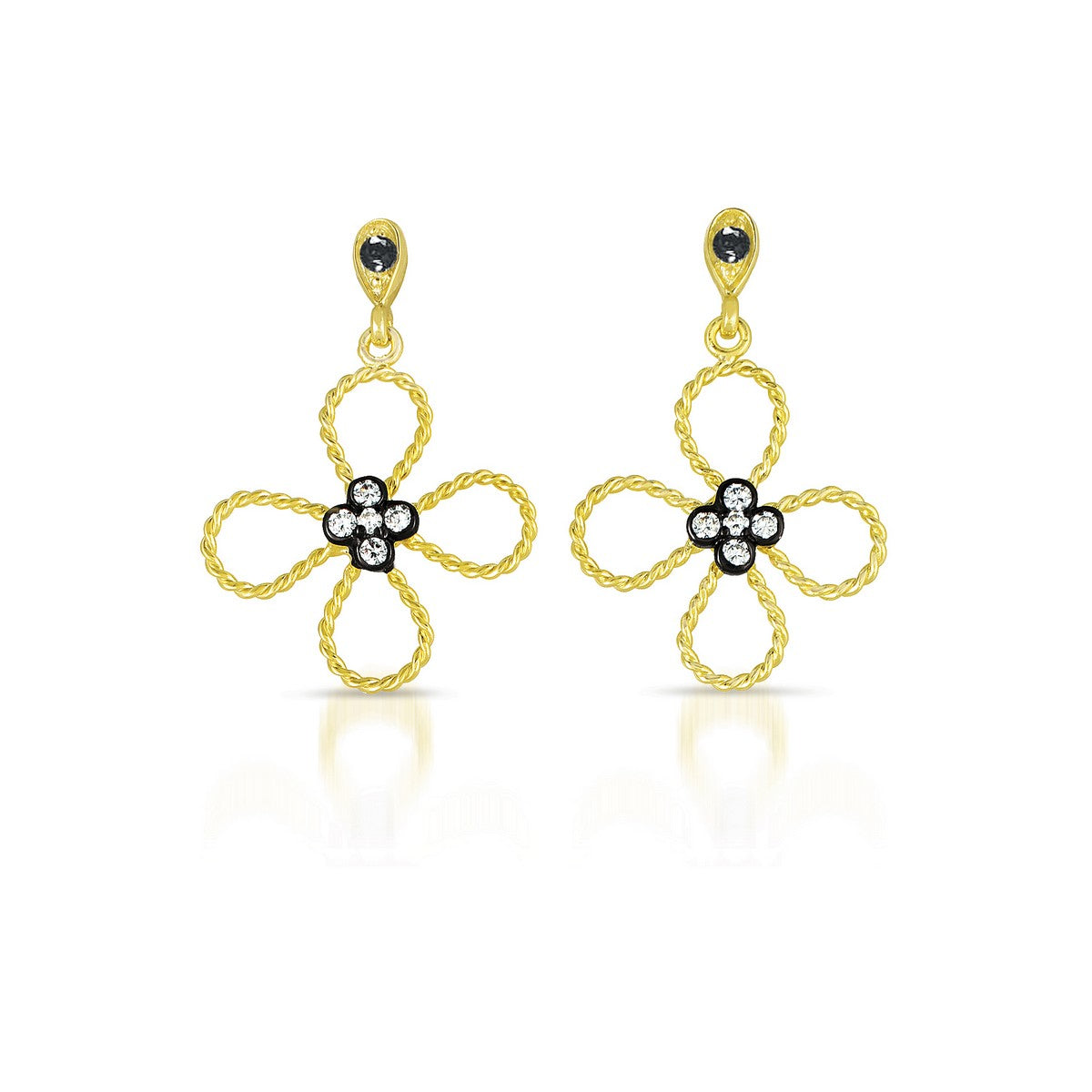 Elegant .925 Sterling silver black and gold plated cubic zirconia drop earrings. These pretty drop earrings feature flower designs creating art deco shapes with clear cubic zirconia accents. Crafted of .925 Sterling silver with black and gold plating and secure with butterfly closure.