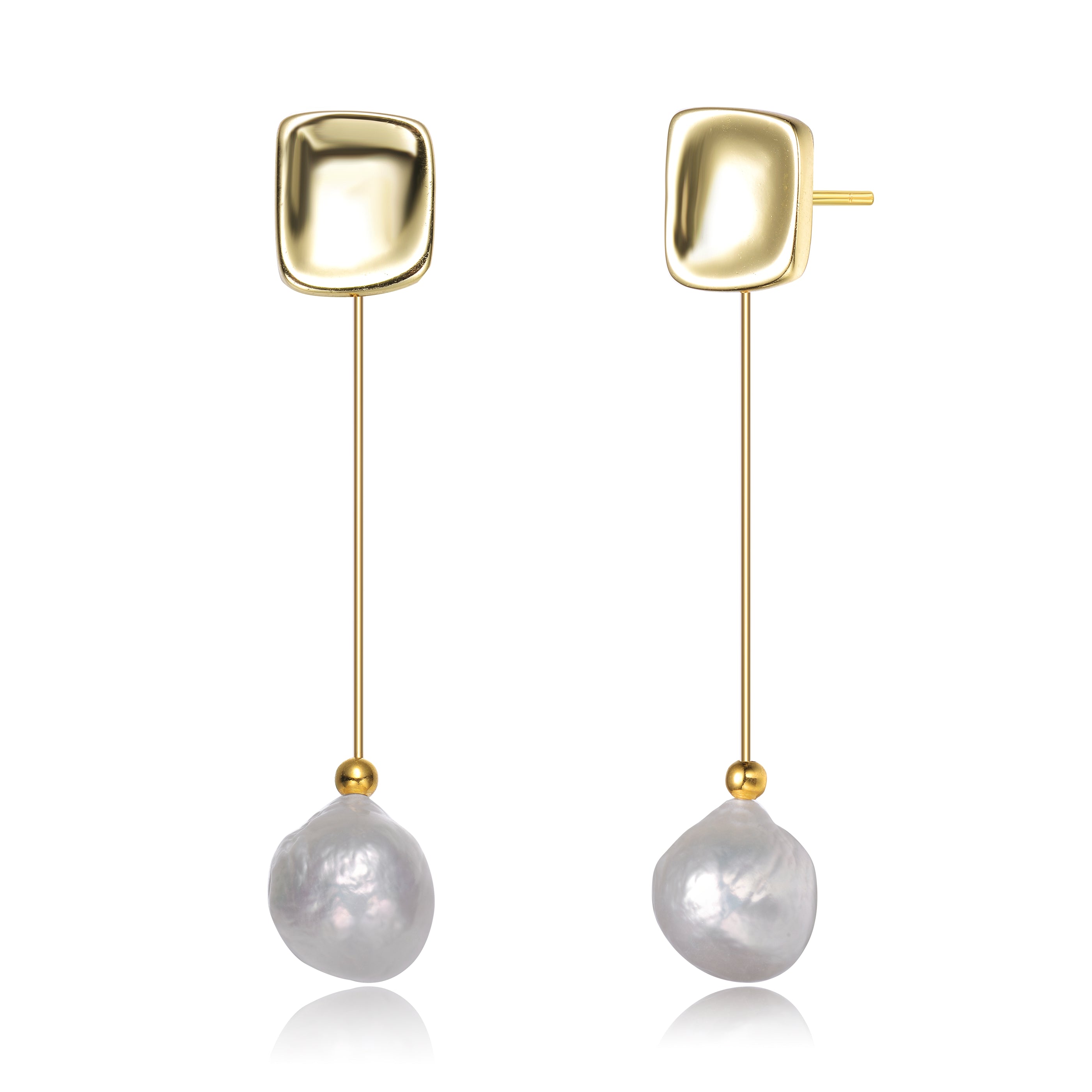 Classy .925 Sterling silver with gold plated and freshwater pearl drop earrings. These earrings feature small rounded freshwater pearls connected to a chain making the perfect drop. The top part is gold square piece. Crafted in .925 Sterling silver with gold plating and it is secured with butterfly closure. This item is sure to complement your outfit. Makes a great gift as well.