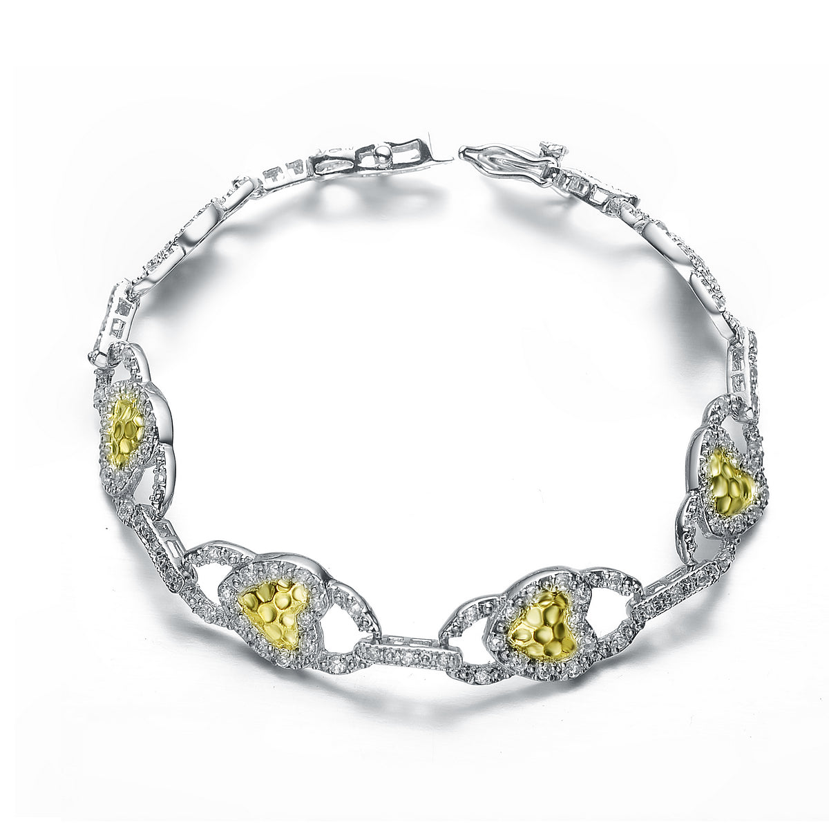 This beautiful .925 Sterling silver rhodium and gold plated bracelet is a lovely addition to your accessories collection. It features interesting design made out of links and hammered heart shape as center. The sides of the links are also decorated with small clear round cubic zirconia stones. Crafted of .925 Sterling silver and secures with a box clasp. makes a great gift as well.