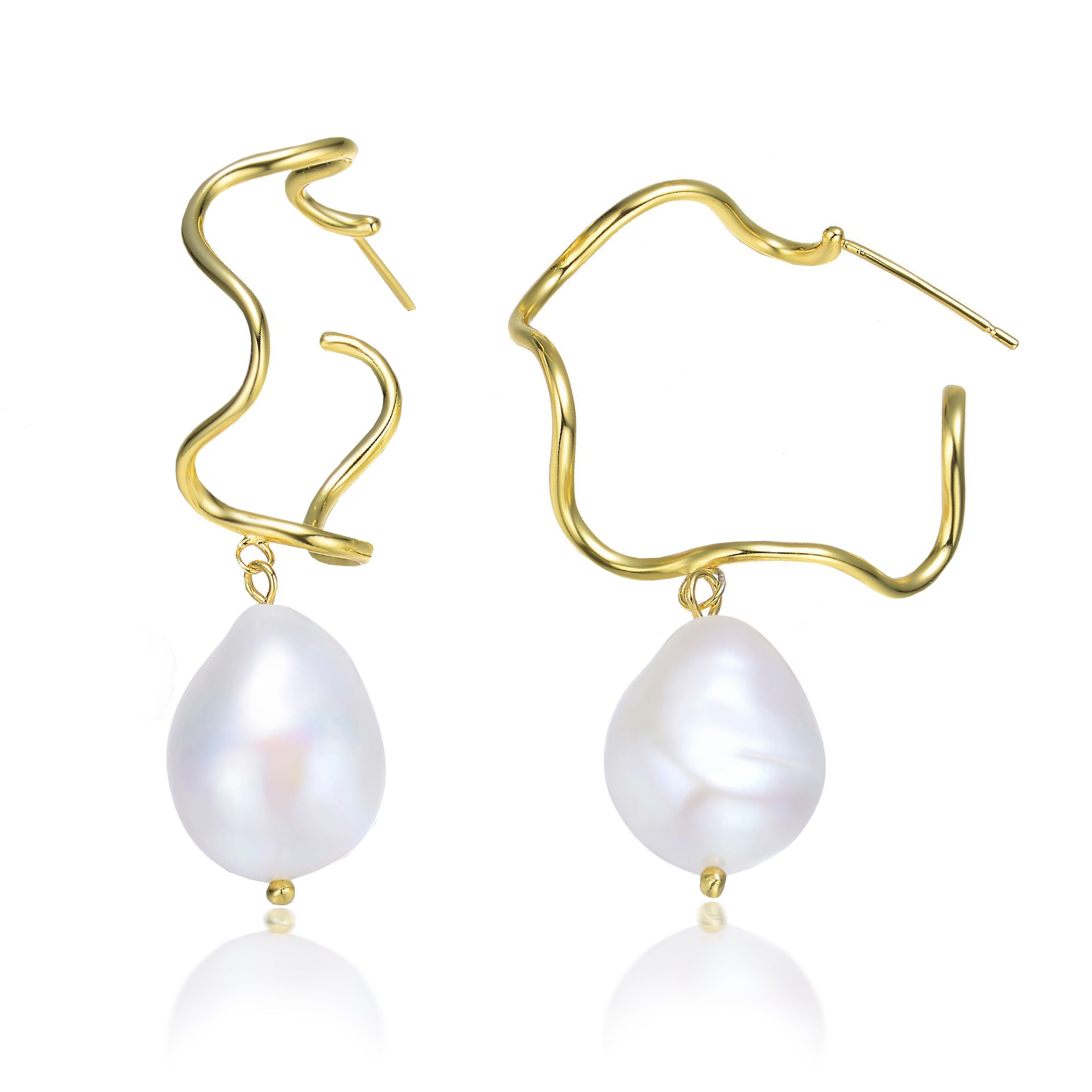 Very stylish .925 Sterling silver with gold plating and freshwater pearl curvy hoop earrings. This special set of earrings features unique curvy dangling hoops with freshwater pearls in it. Crafted in .925 Sterling silver the jewelry is secured with a butterfly clasp. These are perfect for semi formal dresses.