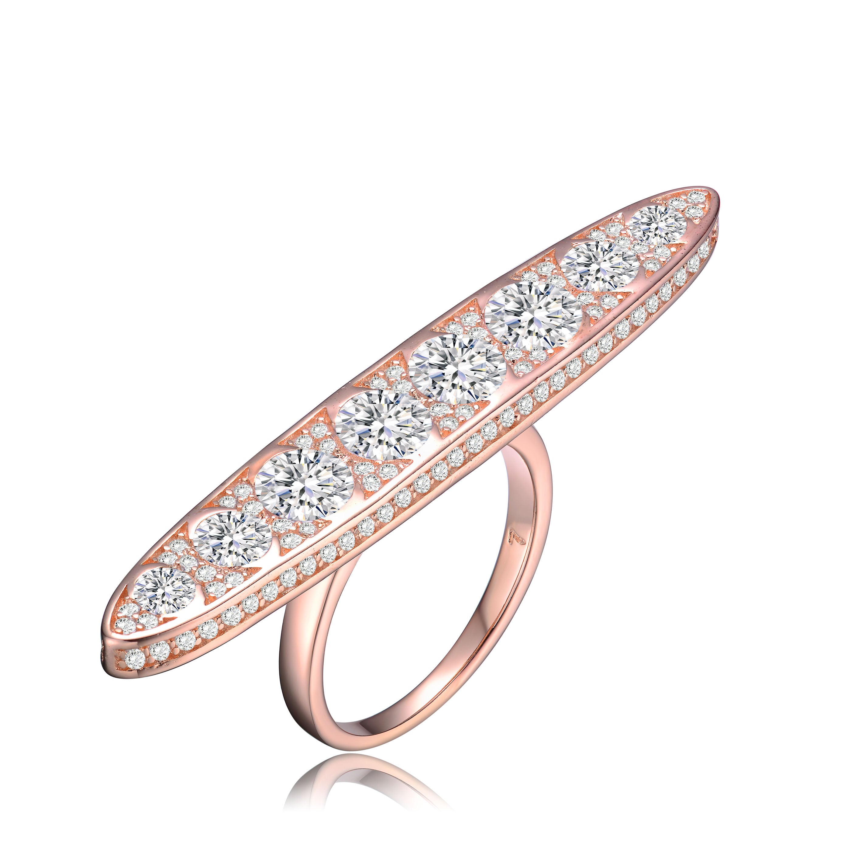 Modern.925 Sterling silver rose gold plated cubic zirconia pave bar ring. This ring features an interesting elipse bar shape with eight large clear round cubic zirconia stones graduating in size from the center to the sides, accented by small clear round cubic zirconia stones paved on the silver frame. Crafted of .925 Sterling silver with rose gold plating and it is available in sizes 6, 7, 8. Makes a great gift as well.