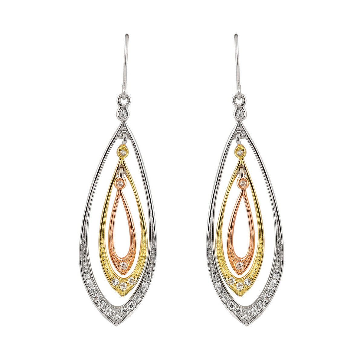 Classic .925 Sterling silver tri color plated cubic zirconia drop earrings. This design features 4 size variant hanging feather shaped frames paved with clear round cubic zirconia stones. Crafted of .925 Sterling silver with rhodium, gold and rose gold plating and secure with fish hook.