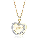 This gold plated cable chain matinee love necklace drops to a heart at the bottom. The heart trinket, engraved with the timeless word 'love' peeks from behind a clinking heart stencil of .925 Sterling silver and stones of cubic brilliance.