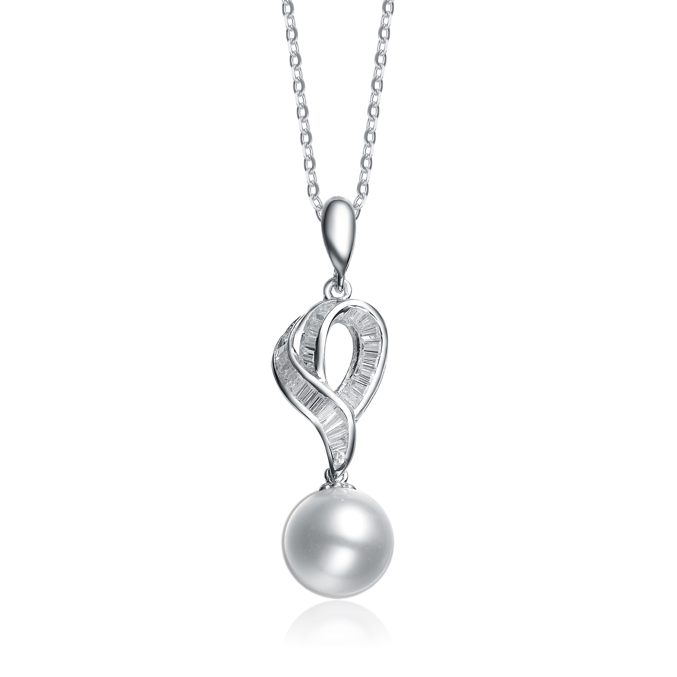 A flowing ribbon of white cubic zirconia and .925 Sterling silver graces the top part of the pendant. A pearl hangs delicately from the ribbon and adds a touch of graceful charm and is very affordable.