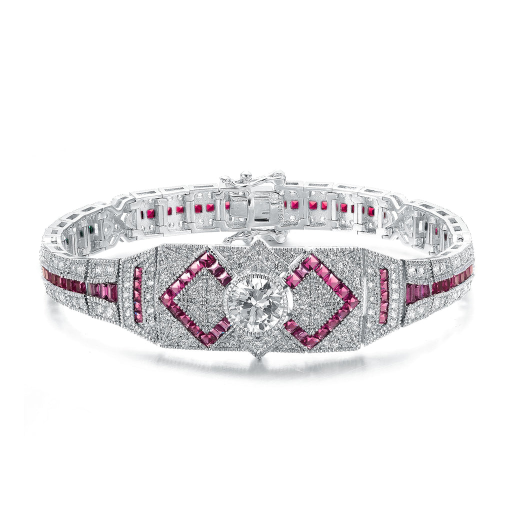 Elegant Sterling Silver Link Bracelet. This bracelet features links with different sizes. The front links are larger and decreasing in size as it continues to the clasp. The links in the middle decorated with large clear round Cubic Zirconia, surrounded by small clear round Cubic Zirconia stones and red princess Cubic Zirconia stones. The side is decorated with clear round Cubic Zirconia stones and ruby red baguette Cubic Zirconia stones. Crafted of Sterling Silver with Rhodium Plated and it is secured with box clasp.