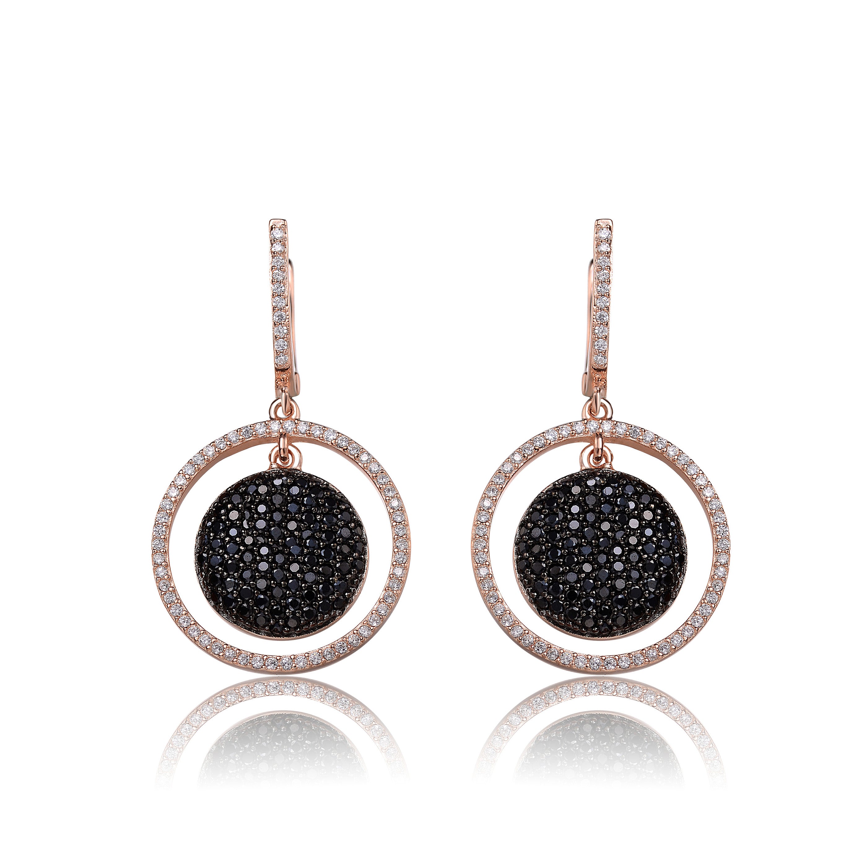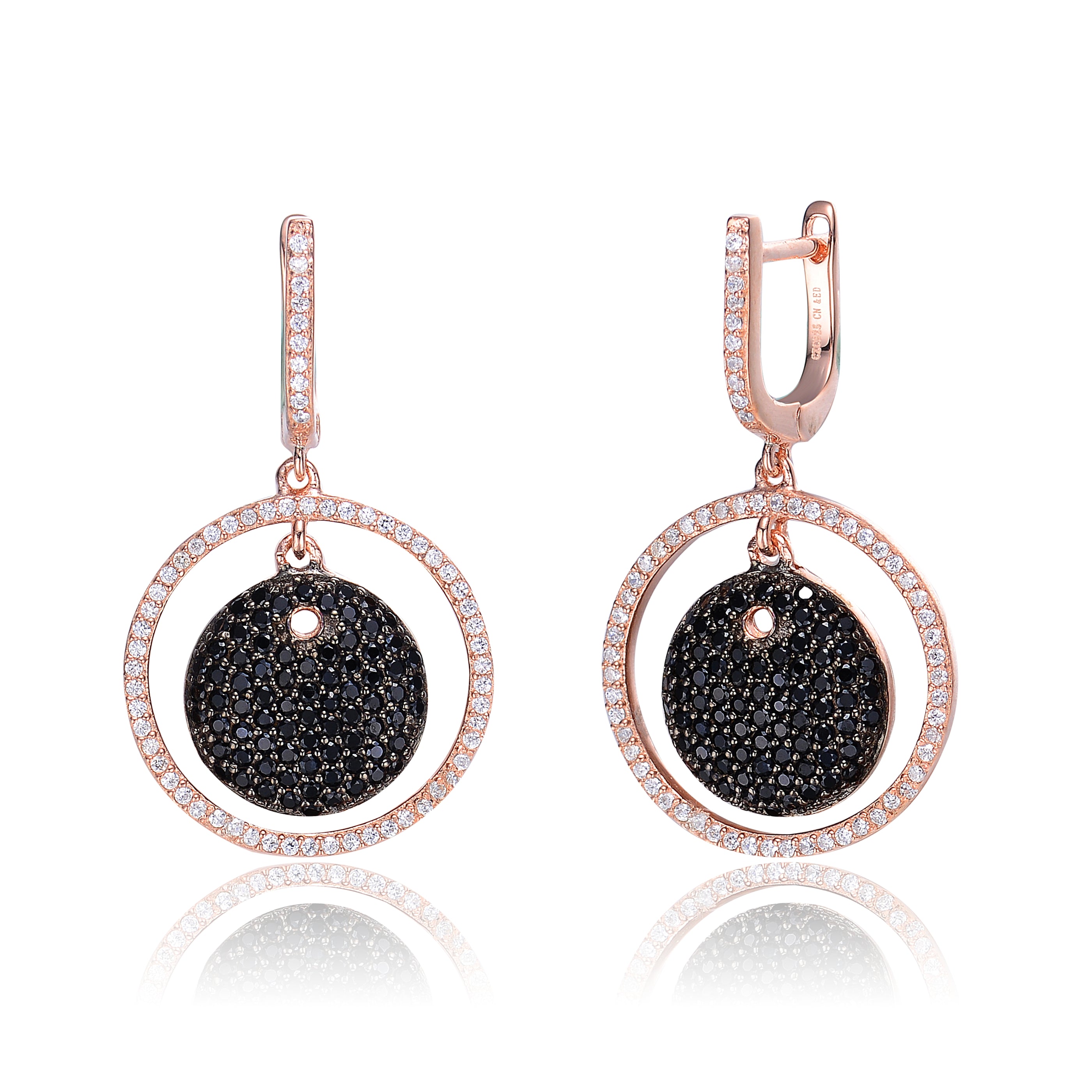 These dainty round dangling earrings are decorated with black and white round-cut cubic zirconia stones. Crafted of 0.925 sterling silver, with rose and black plating, the earrings secure with clip-in clasps.