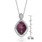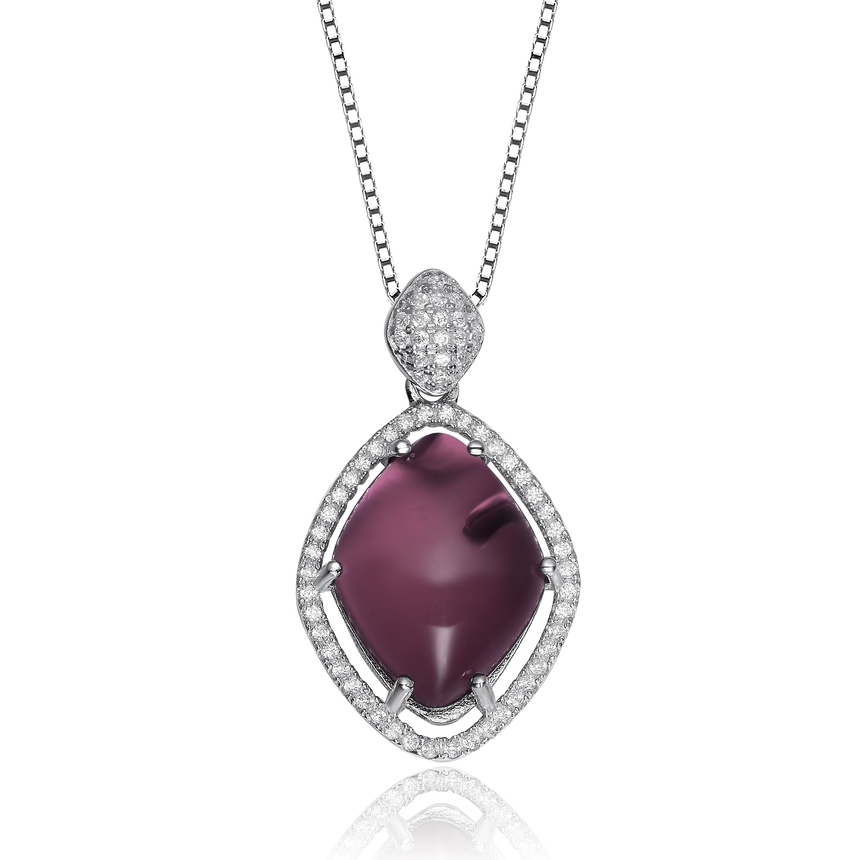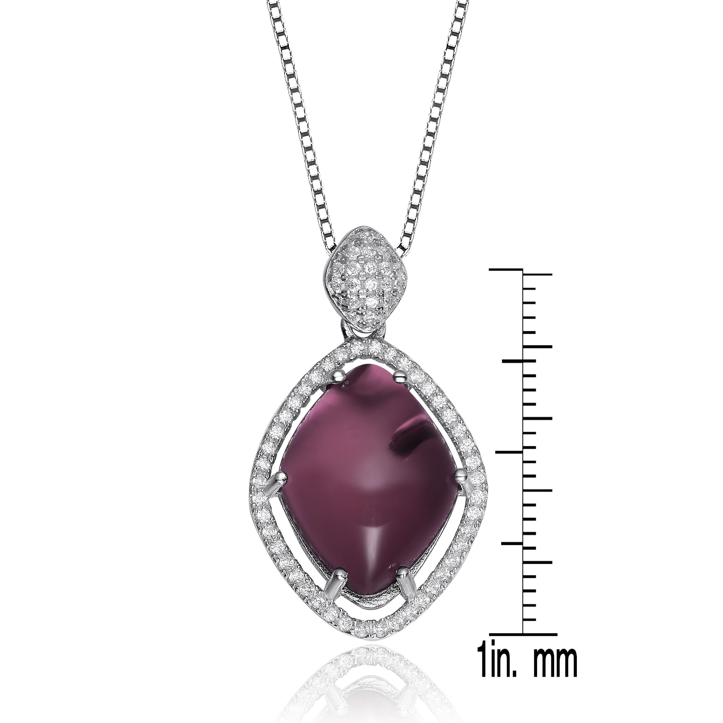 This elegant pendant showcases a stunning amethyst-colored, teardrop-shaped cubic zirconia stone at its center. The faceted stone gleams with a glossy finish, capturing light beautifully. Surrounding the central stone is a delicate halo of clear, round cubic zirconia stones, adding extra sparkle. The entire pendant is crafted from sterling silver and plated with rhodium, giving it a bright, reflective surface.