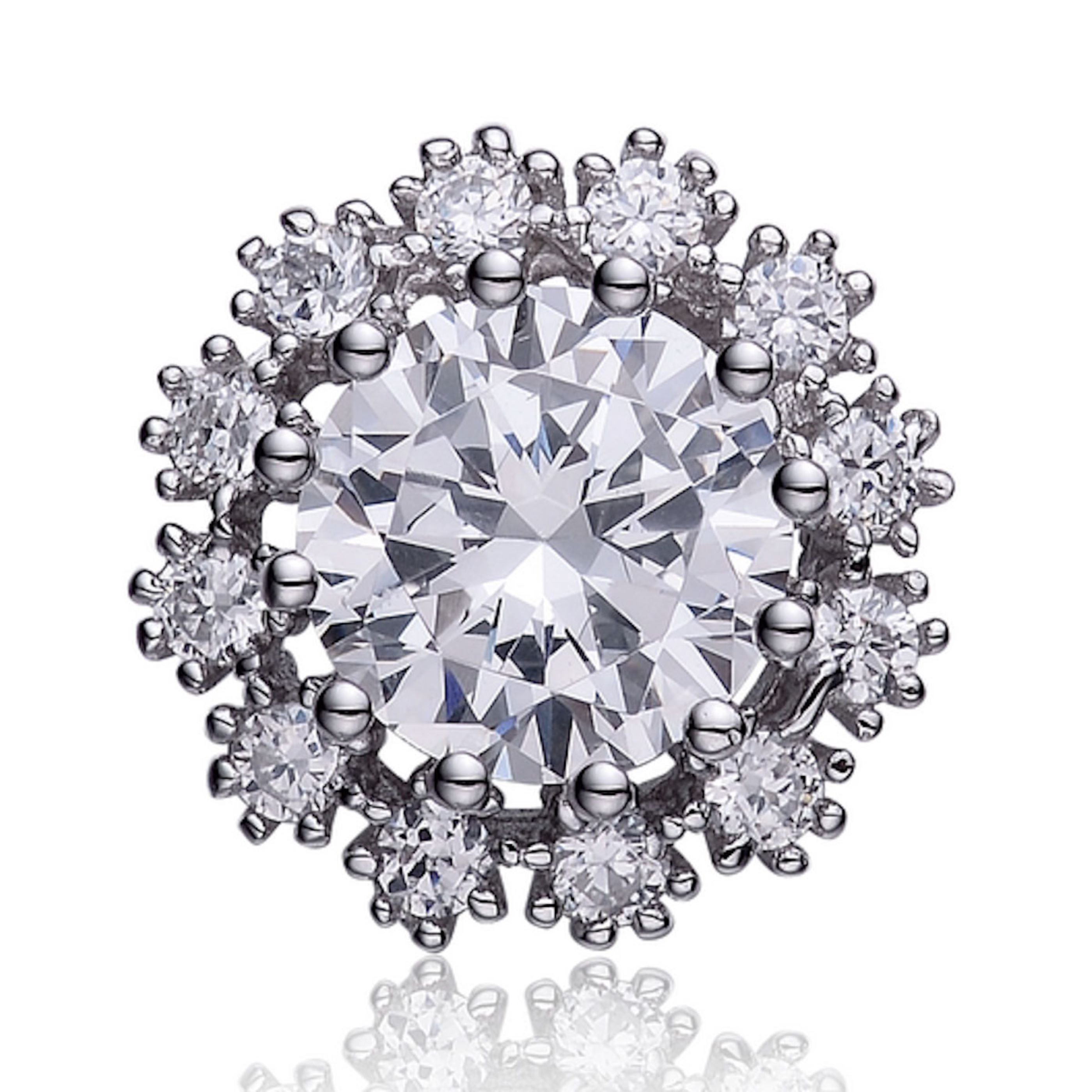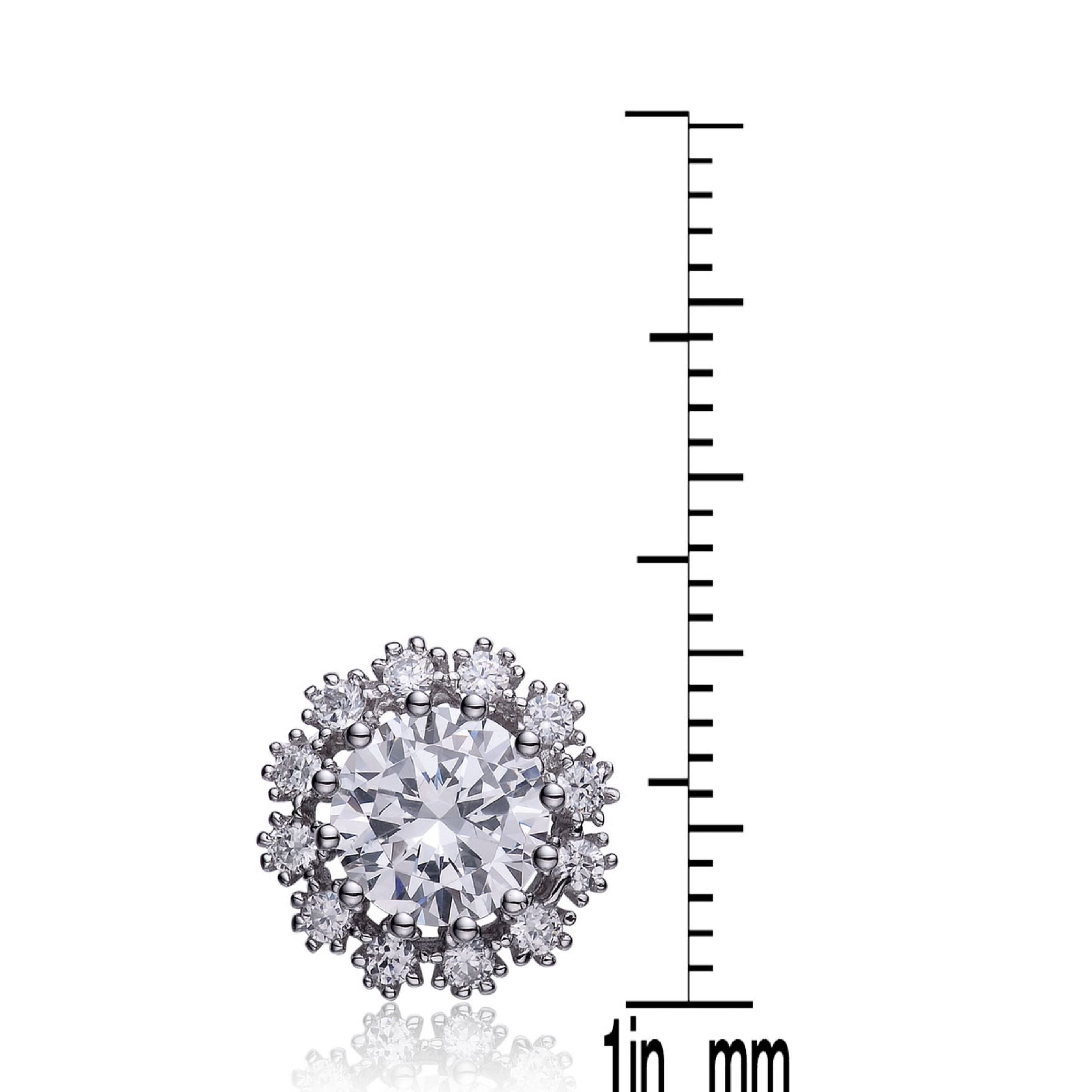 The beautiful flower design stud earrings are set in fine sterling silver, plated with rhodium, and stamped ""925"". dazzling 2 aaa grade prong set round 7mm cubic zirconia stones weigh 2.56 ct.tw. the smaller prong set round 1.75mm cz stones weigh 0.4 ct.tw. the earring measures 0.4 inch in diameter. edge posts with butterfly backs for pierced ears.