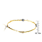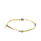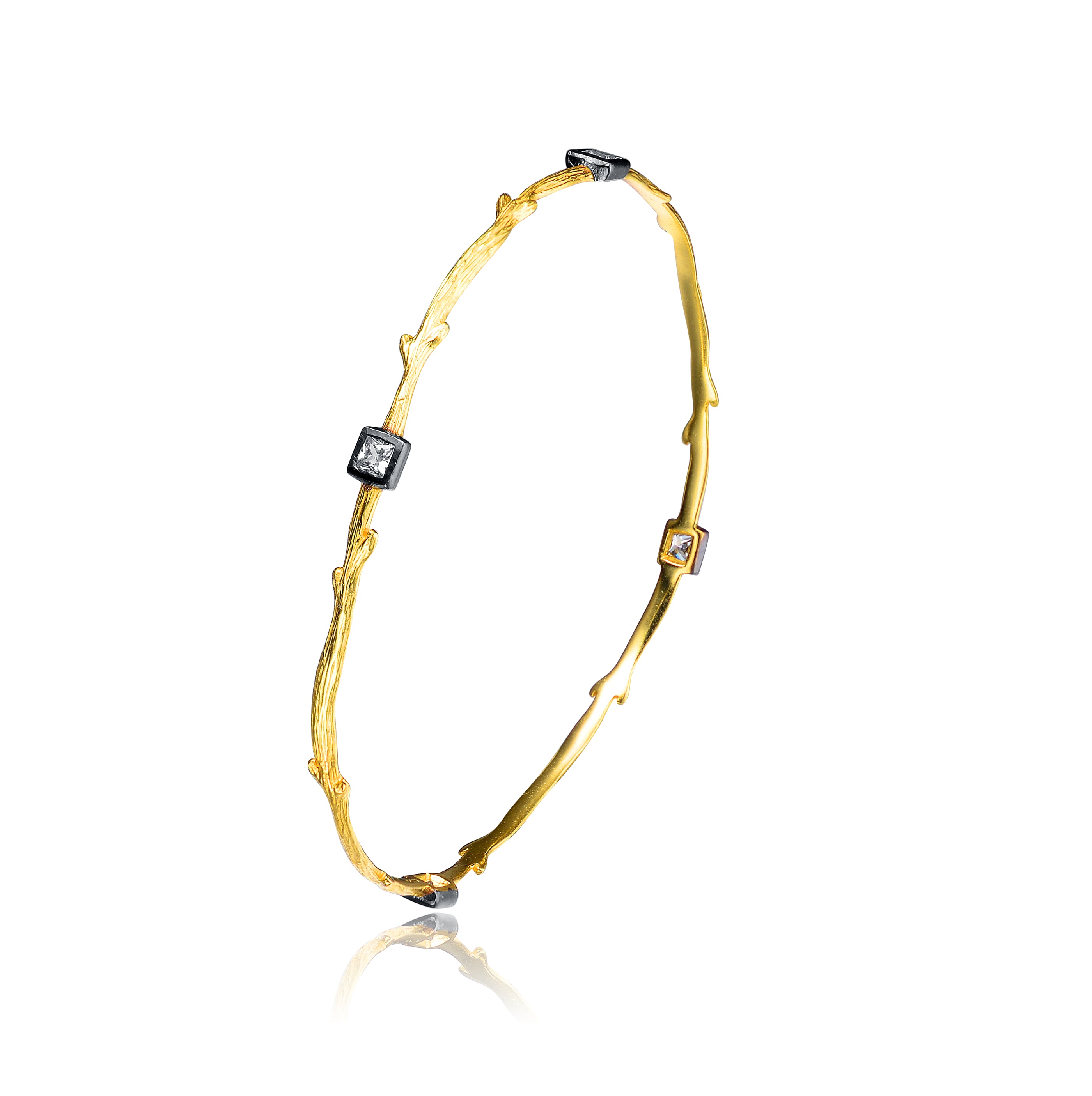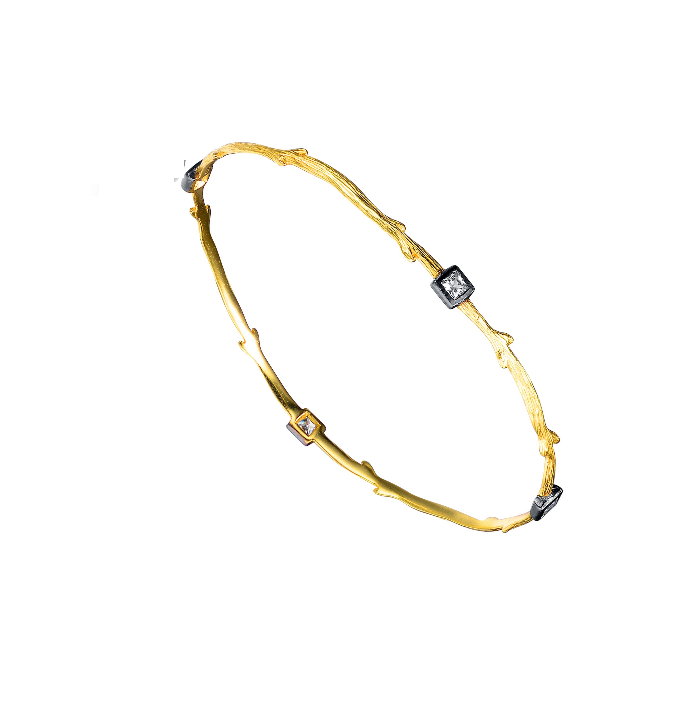 This bracelet carries a curved wooden twig resemblance in shape. Gold plates it's entirety and square charcoal encased cubic stones decorate magnificently at four interims.