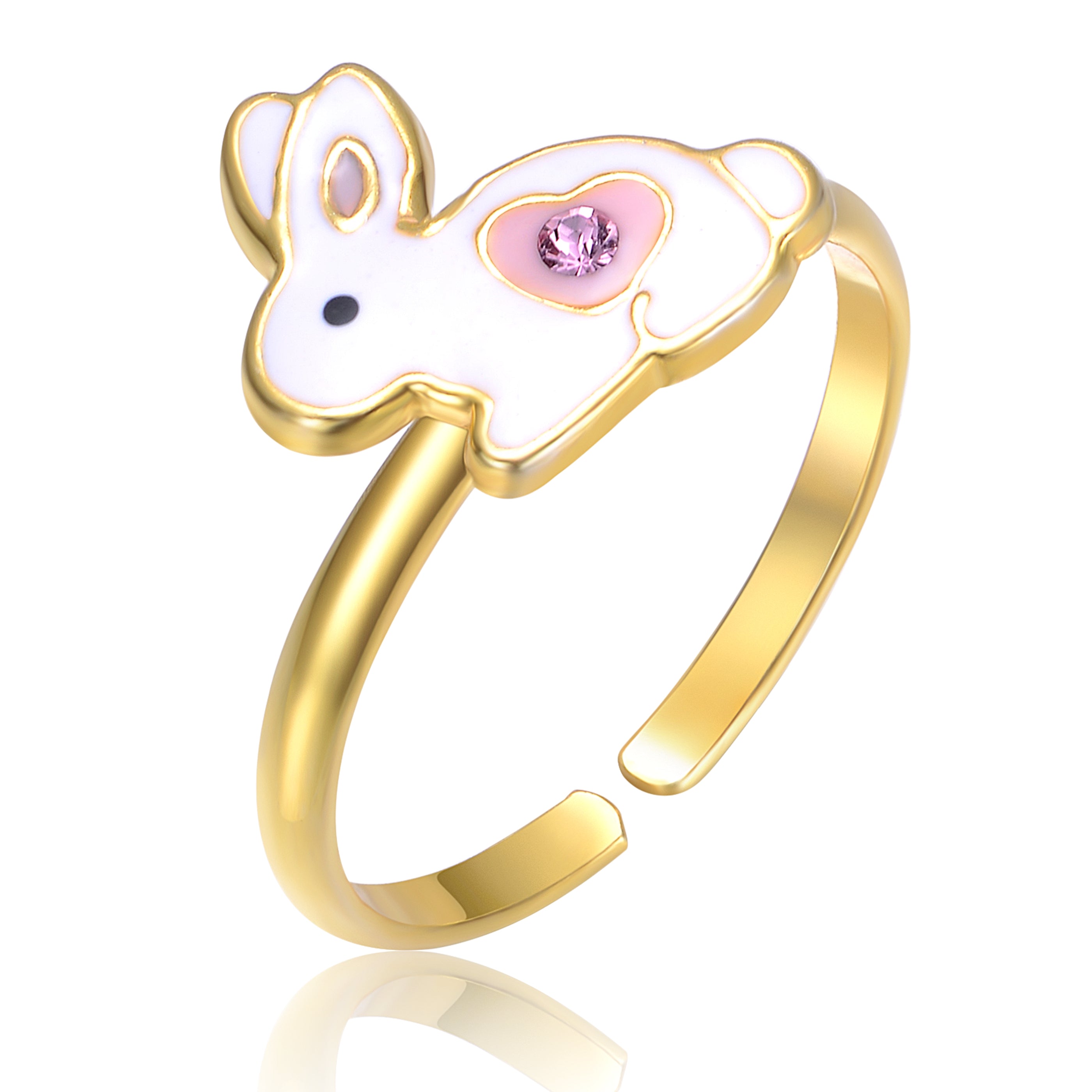Children's 14k Gold Plated White & Pink Bunny Rabbit Adjustable Ring. This brightly polished 14k gold plated kid's ring makes a bespoke present for your lovely child for a holiday, birthday, and more. A super-adorable white and pink bunny on the top of a slim band adds happiness to any day. The ring is adjustable in size, allowing this sweet ring to accommodate different finger sizes with comfort as the ring opens and bends for convenience.