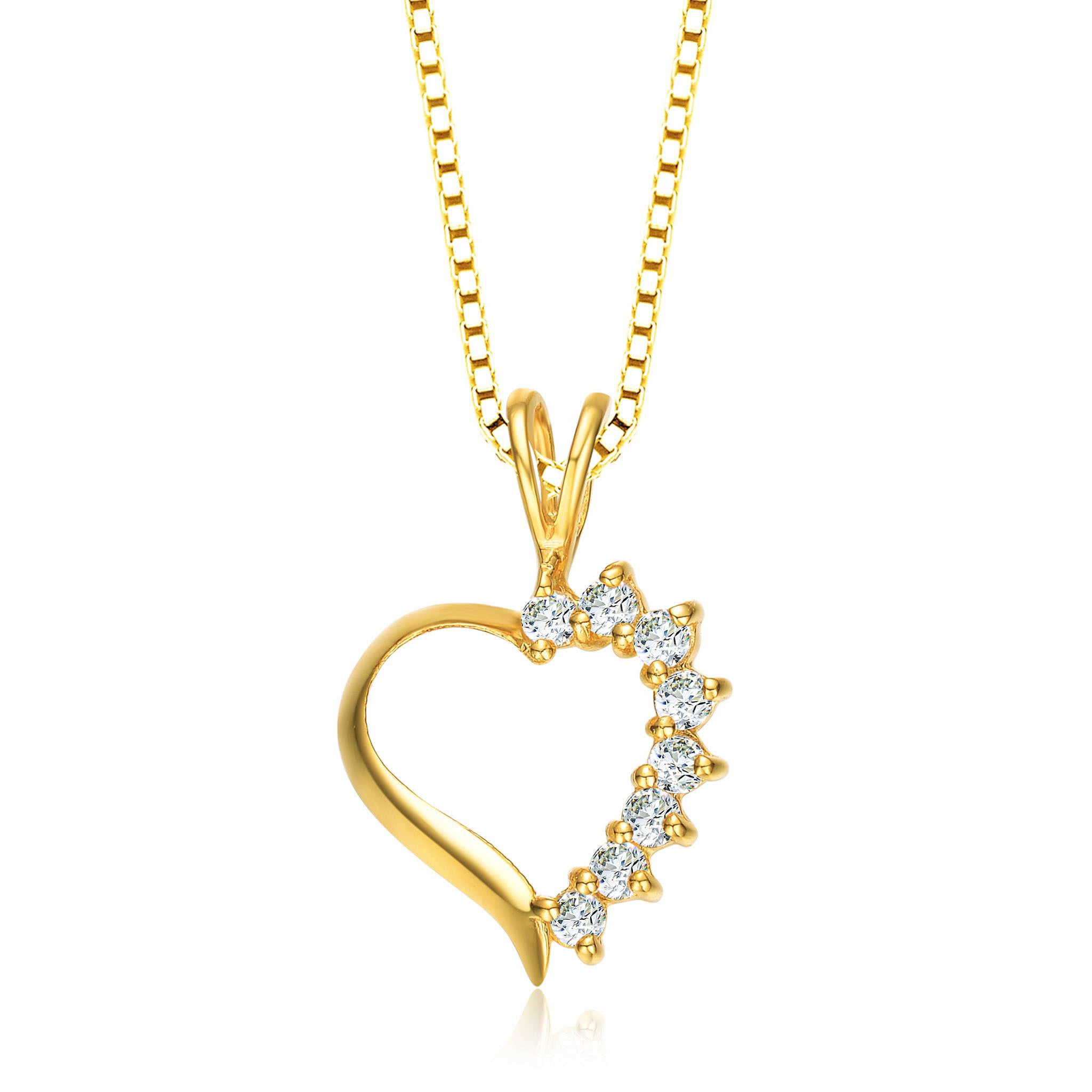 Our shimmering girls/teens' heart pendant is sure to warm your heart. Made of sleek 18kt yellow gold-plated silver, it is adorned with stunning cubic zirconia stones that add that undeniable sparkle. The unique studded heart design provides a new take on the classic heart pendant. It is a stunning touch to a formal outfit that will take your breath away.Β