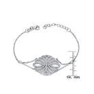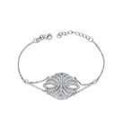 This finespun rolo link bracelet is composed of endearing silver molding. A rounded platelet of interwoven cubic zirconia shines at the forefront. A lobster claw connects both ends to a choice of several loops to conveniently widen sizing options.
