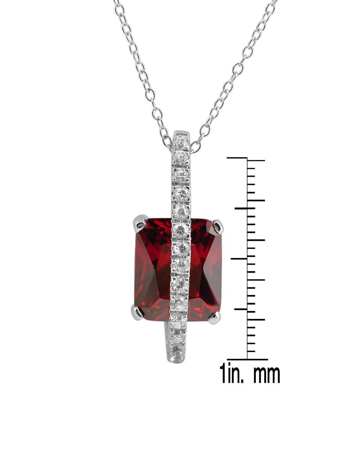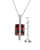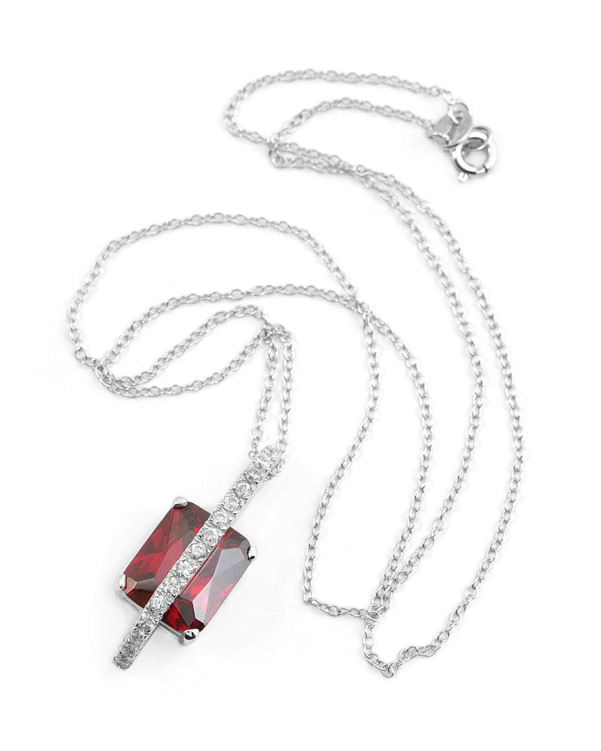 This elegant pendant features a captivating square-shaped cubic zirconia stone in a rich garnet color. The stone is meticulously faceted to enhance its brilliance and is securely mounted in a sterling silver bezel with a rhodium plating. Above the main stone, a column of smaller, clear cubic zirconia stones adds extra sparkle, leading up to the bail through which the matching sterling silver chain passes. The combination of the deep red hue of the garnet-like stone and the dazzling clear cubic zirconia creates a luxurious accessory that mimics the appearance of precious gemstones. Whether worn for special occasions or as an everyday statement piece, this pendant exudes elegance and sophistication.