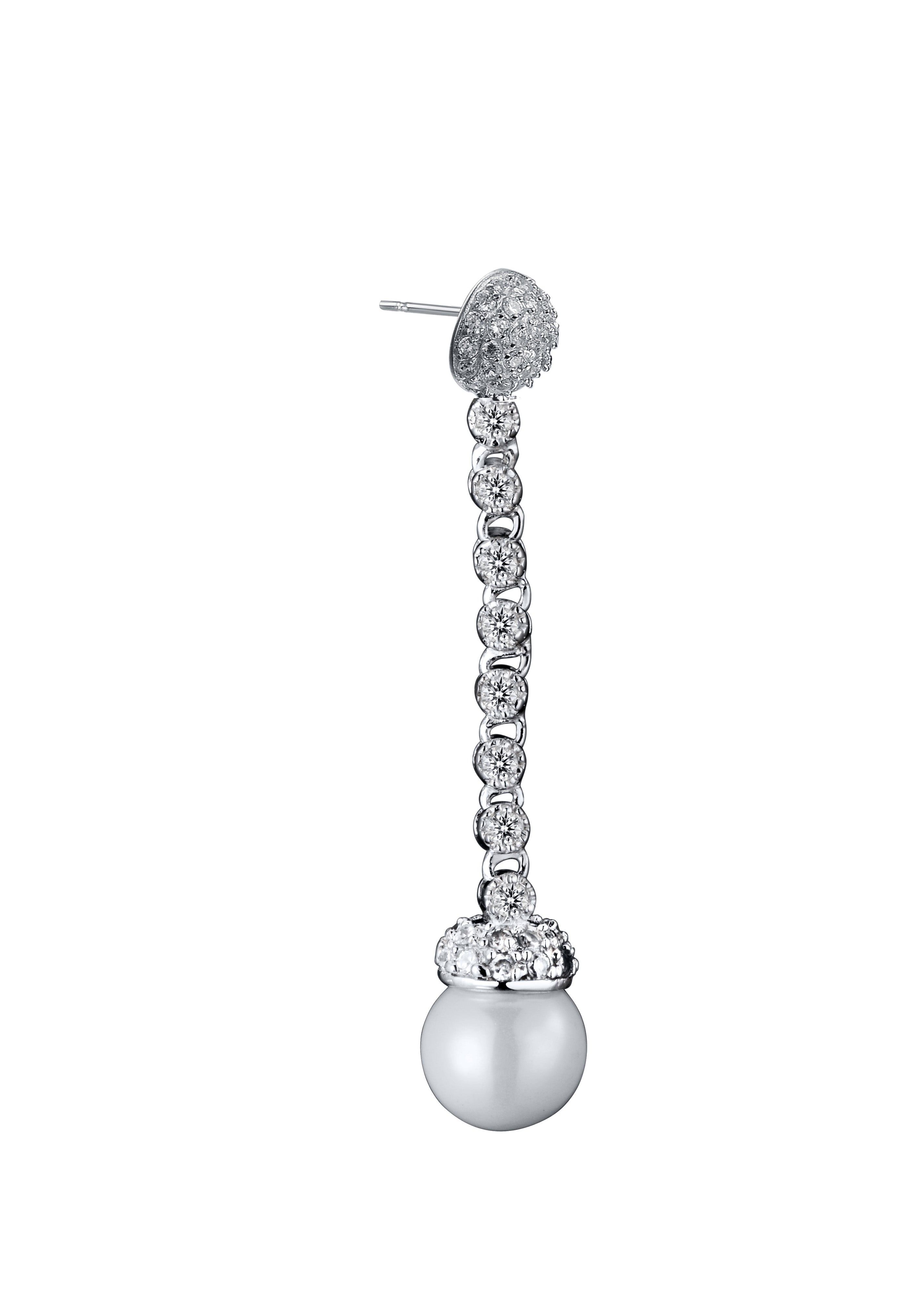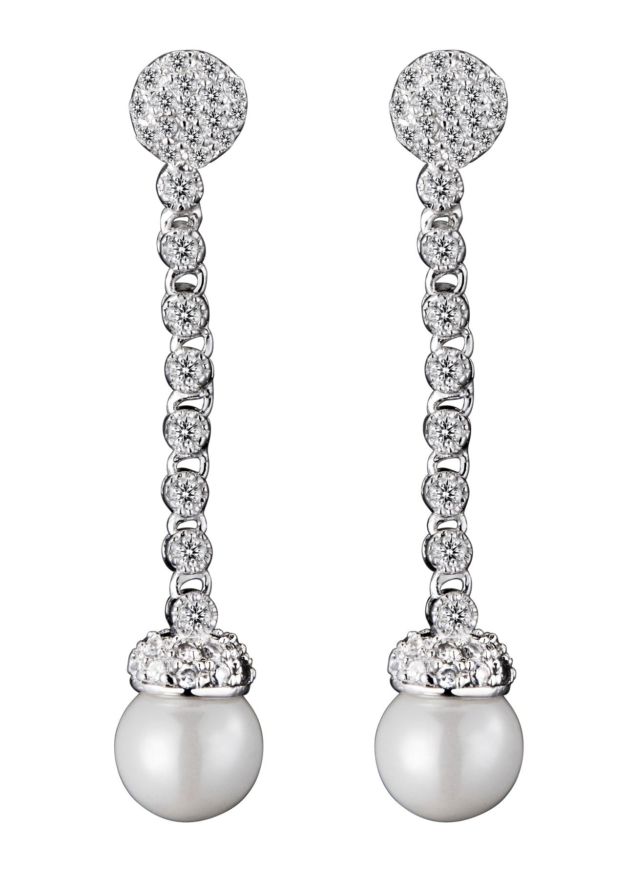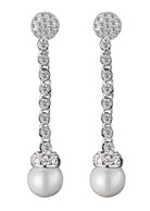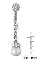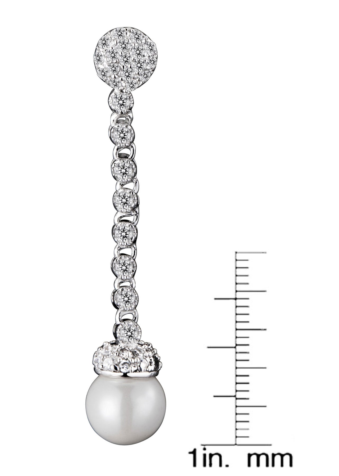 A white faux pearl dangles from a long row of prong-set clear cubic zirconia rounds on these fantastic earrings. Crafted of .925 sterling silver, these earrings secure with butterfly clasps
