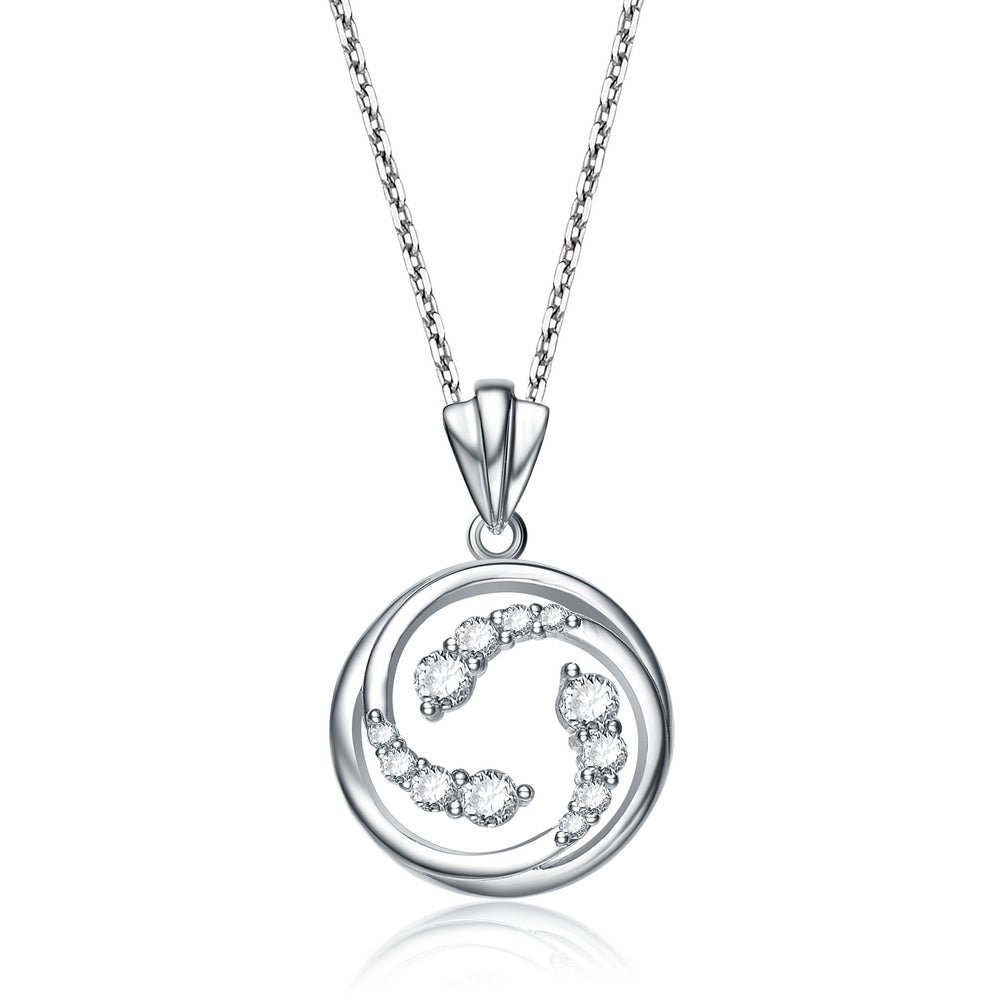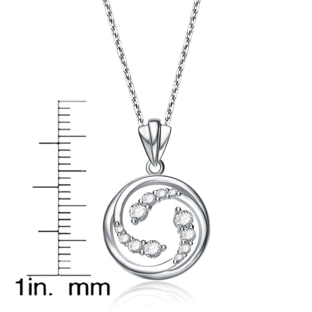 This dainty dangling pendant features white round-cut cubic zirconia stones decorating swirl designs. Crafted of 0.925 sterling silver, the necklace secures with a spring ring clasp