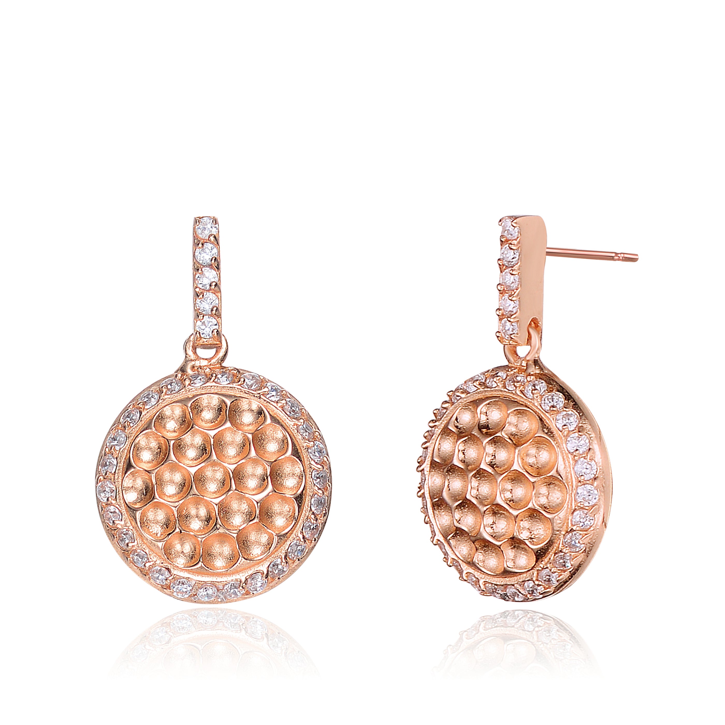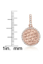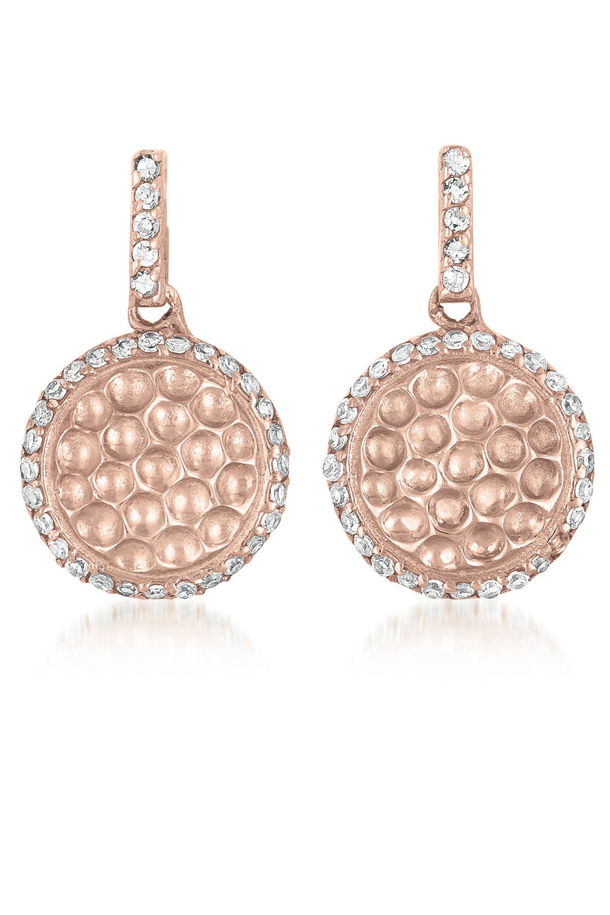 These earrings feature round-cut cubic zirconia outlining a circular hammered finish plate of sterling silver. The earrings are rose-plated and secure with butterfly clasps.
