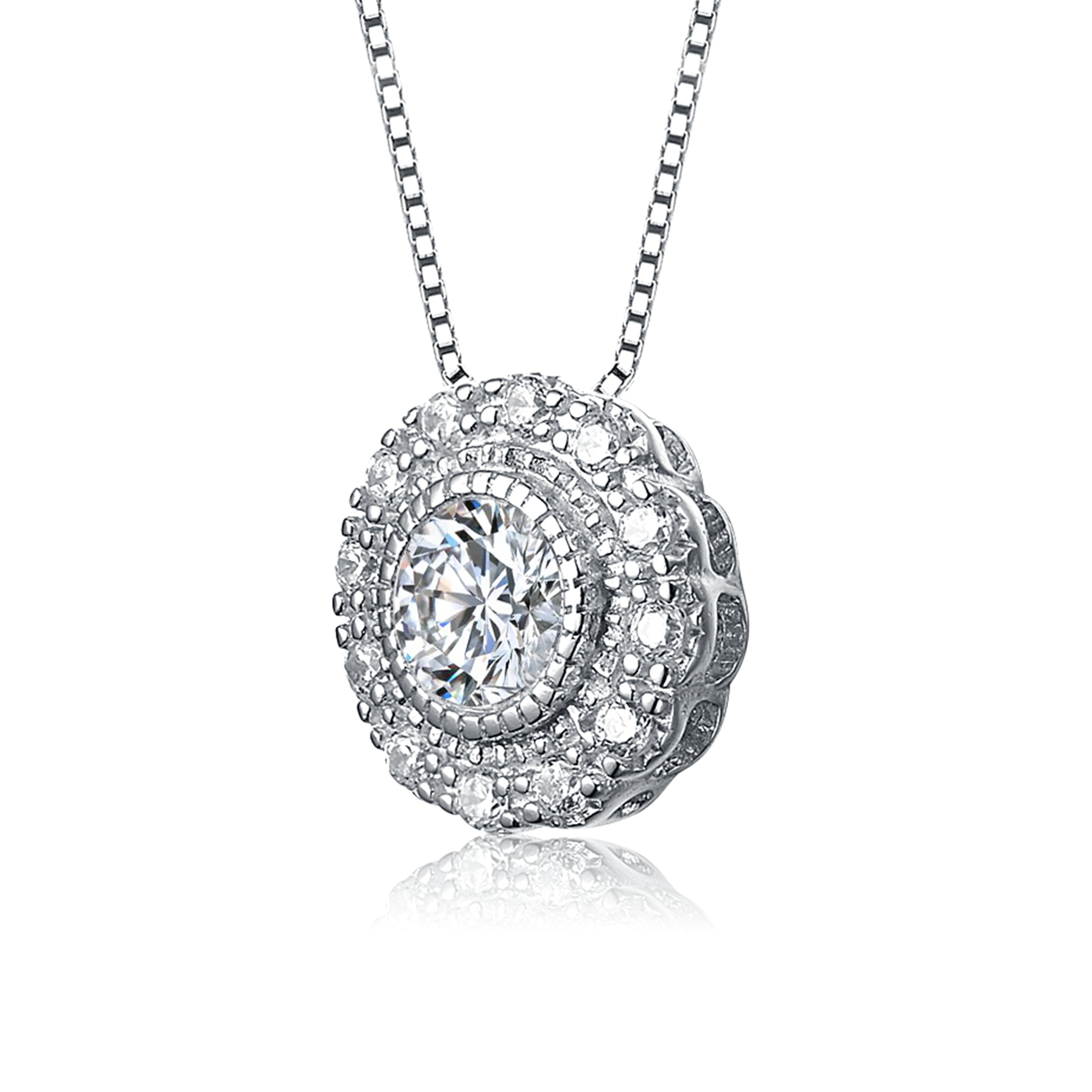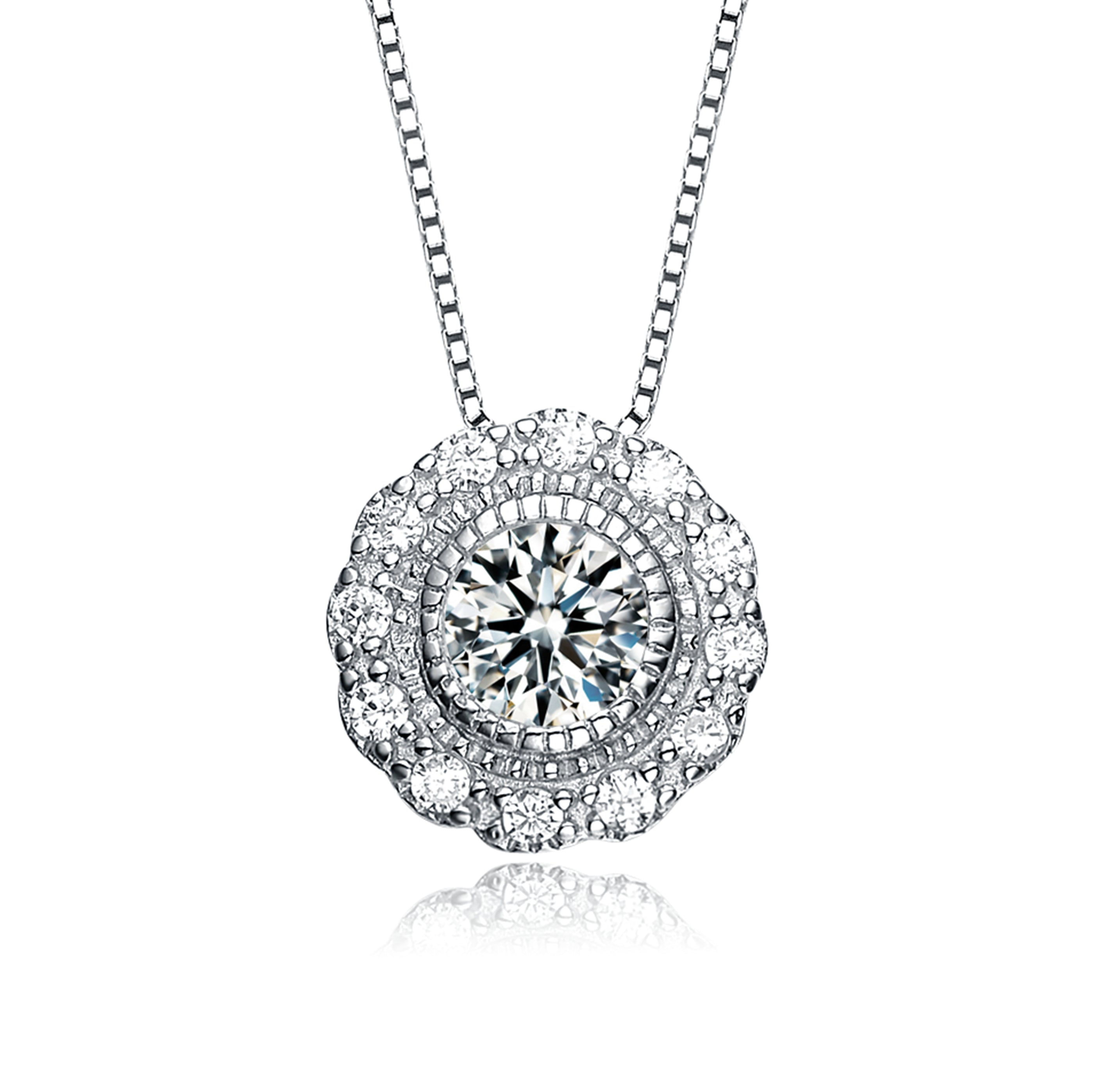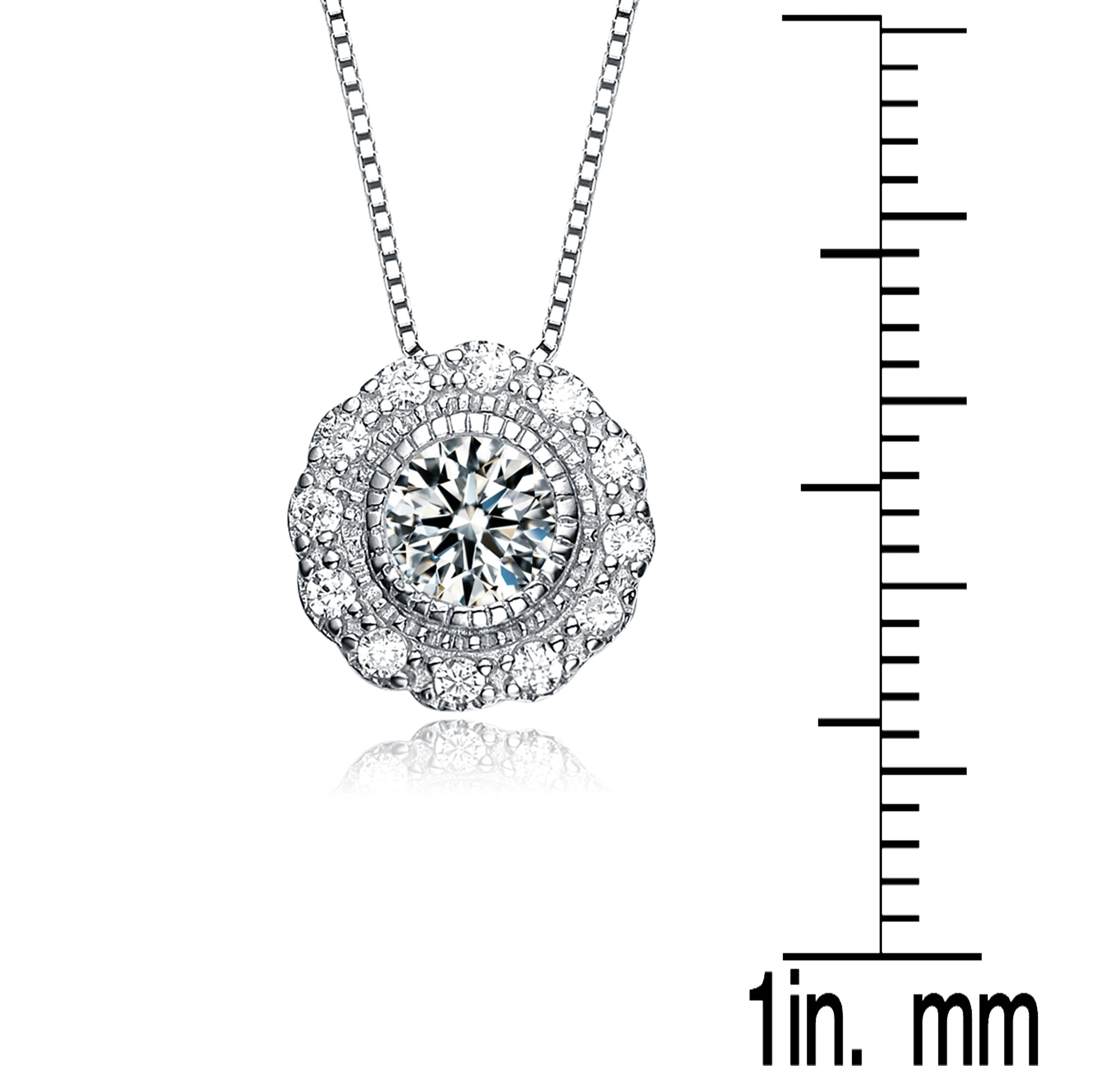 This dainty pendant features white round-cut cubic zirconia stones creating a flower design. Crafted of .925 sterling silver, the necklace secures with a spring ring clasp.