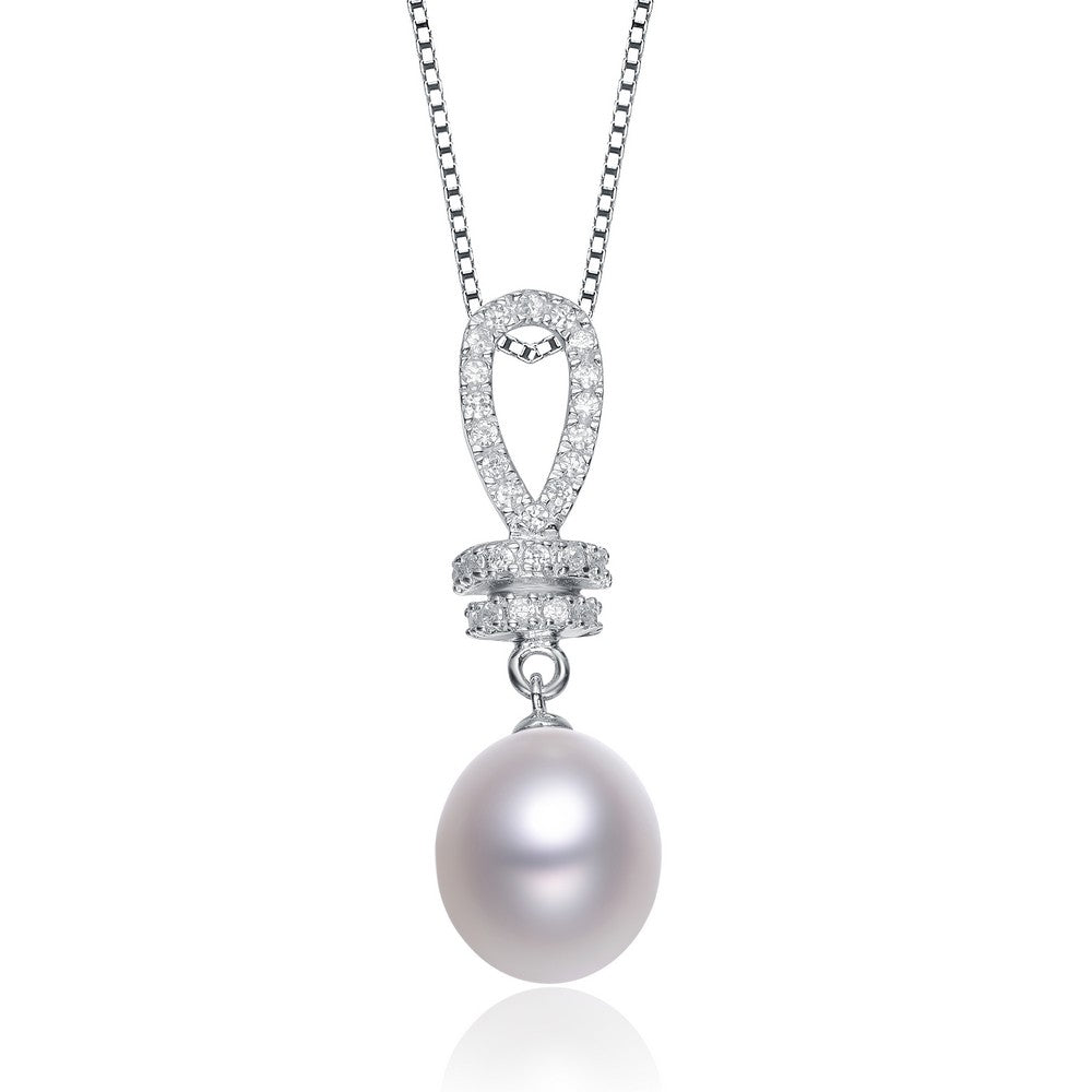 A classic pendant ups the ante with tastefully crafted shimmering embellishments. A glistening freshwater pearl is gilded with bands of cz accents set in .925 Sterling silver. It comes with an 18 in. Chain and has a spring ring closure.