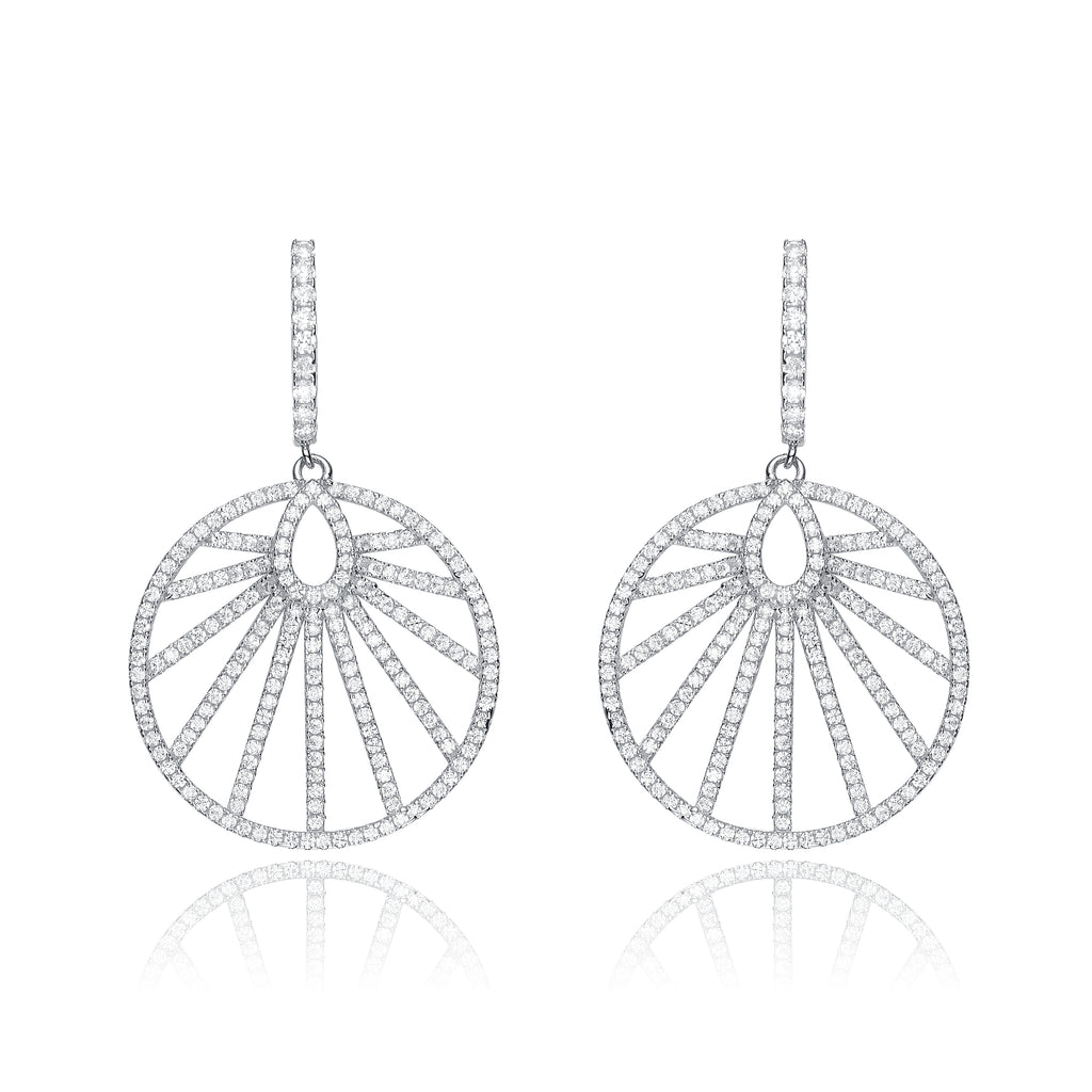 Bits of blazing cubic zirconia set in fine sterling silver amass a large wheel of fluctuating inside rows for a cultured look. The wheels hang from equivalently decorated rectangular cutlets to complete these fine drop earrings.