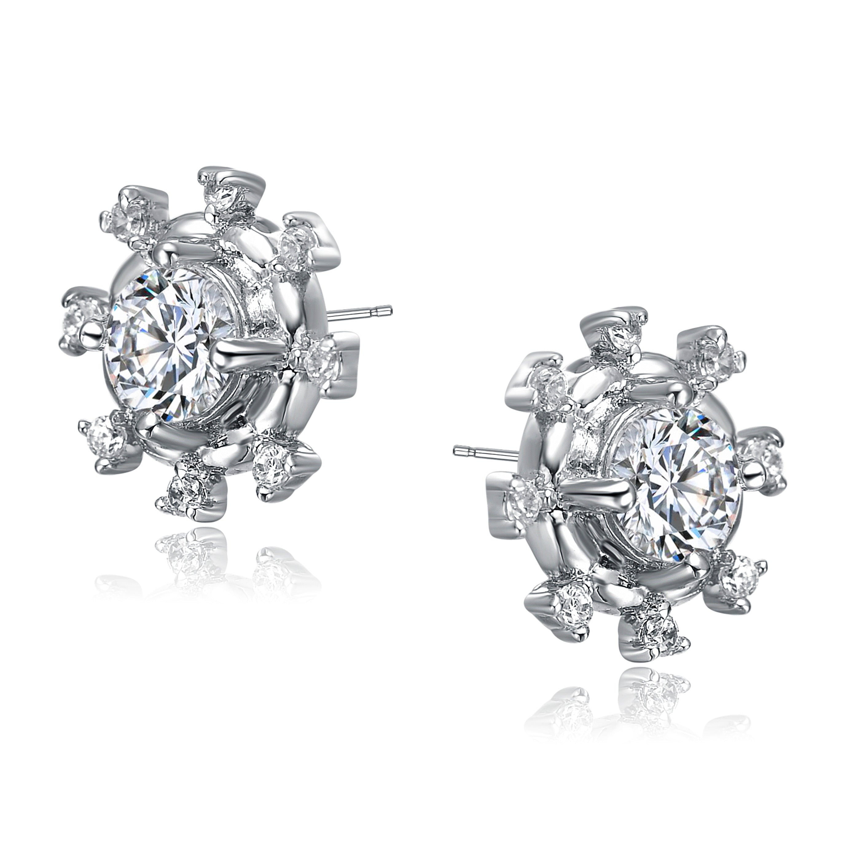 Daring waves of sterling silver climb throughout these fun stud pushbacks. A square charm of cubic rests at the center. Three prongs of silver plated prongs each hold circlets of gleaming cubic distributed about the edges.