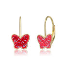 Perfect for your princess, these dainty leverback drop earrings feature a 14K gold plated leverback that holds a charming red butterfly design. The outer butterfly is adorned with gold pearls, while the inside features red enamel with white dots. These sterling Silver earrings are very cute, dainty, and ideal for toddlers and young kids.