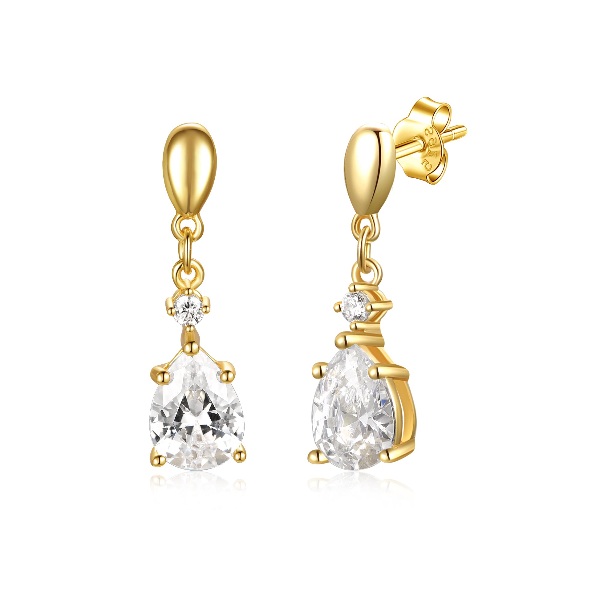 Add elegance to any outfit with these glamorous dangle earrings. Sparkling pear-shaped and round brilliant cut cubic zirconias are prong set in a 2-stone design. Raindrop designs on the top lend these pretty earrings a vintage appeal, all finely crafted in 14k gold plated sterling silver. Butterfly backs keep them secure.