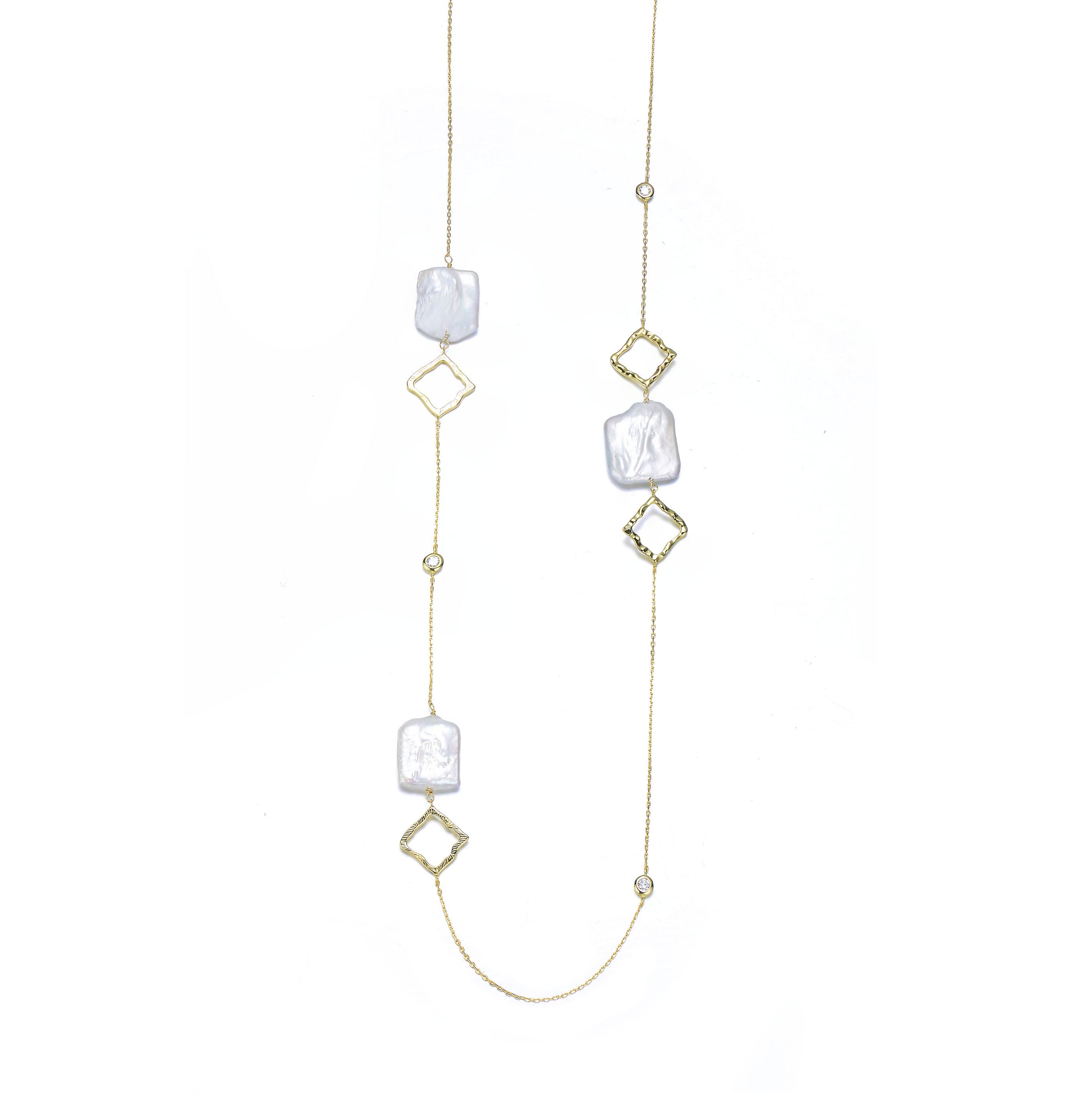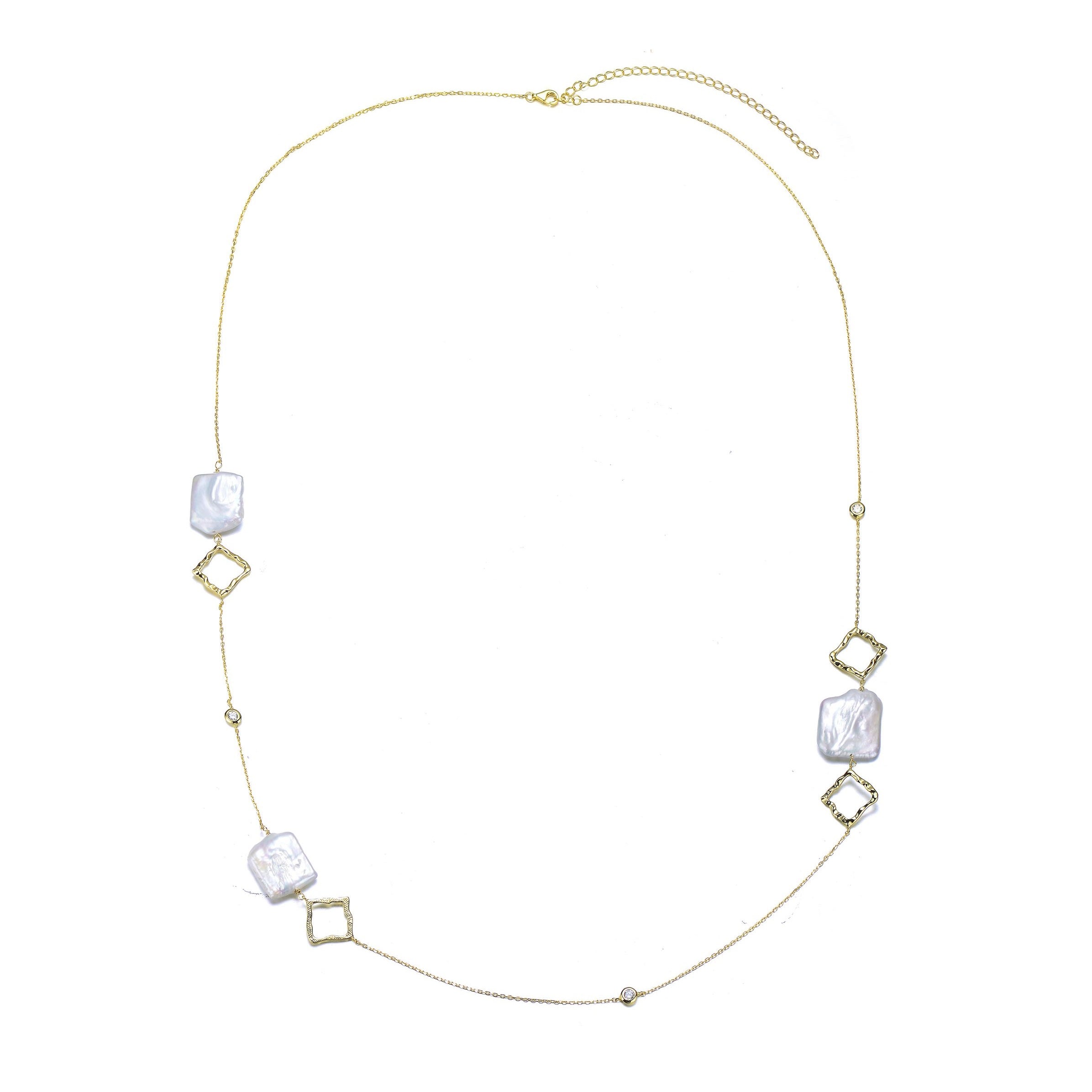 Elegant Sterling Silver with Gold Plating, Freshwater Pearl and Cubic Zirconia Station Necklace. This necklace features square-cut Freshwater pearls and -shaped gold plated metals that have uneven surface texture designs. In between sets, bezel-set round Clear Cubic Zirconia accent the piece. Crafted in .925 Sterling Silver, the jewelry is secured with a spring clasp. This necklace is perfect for a formal event. It is also an ideal present for a special ocassion.