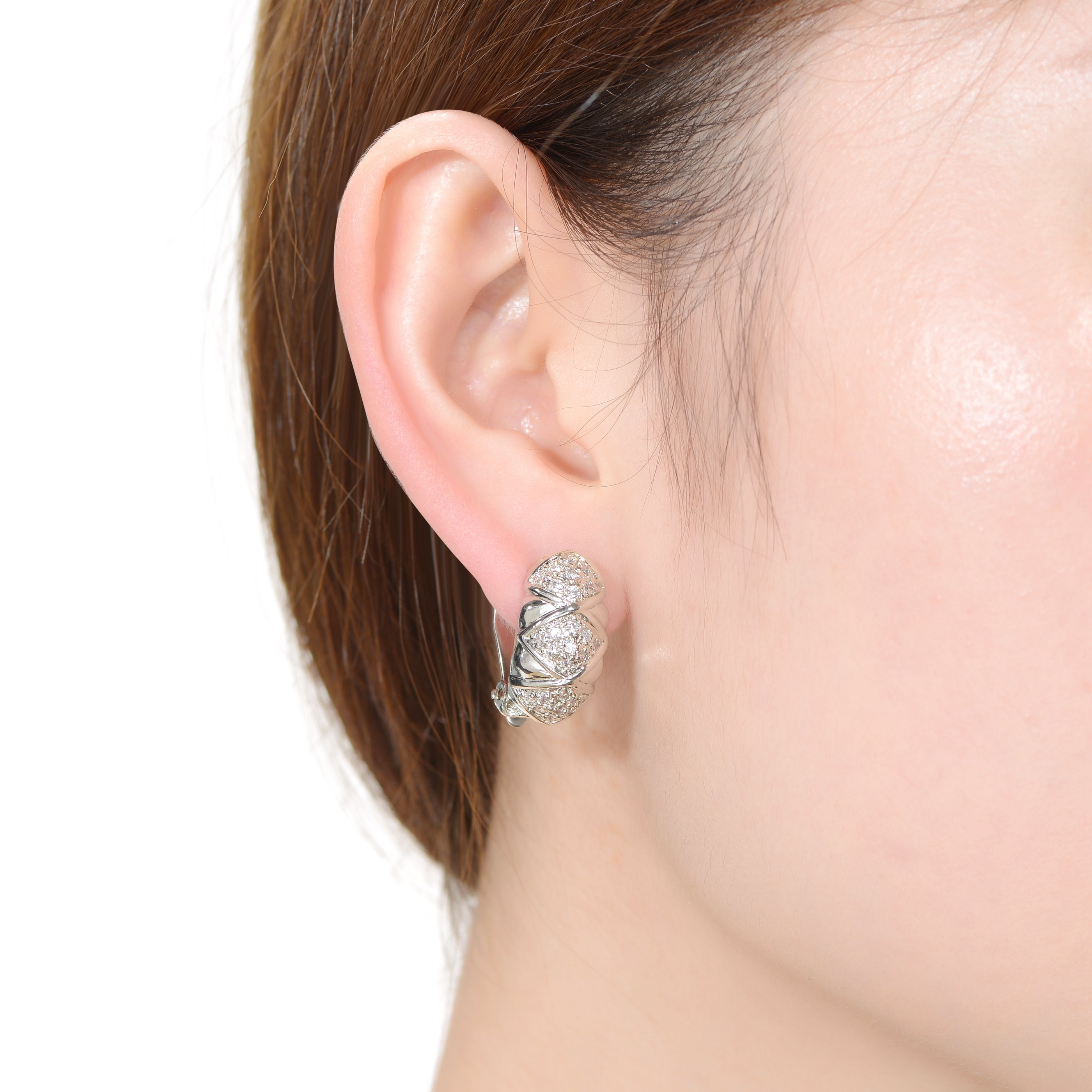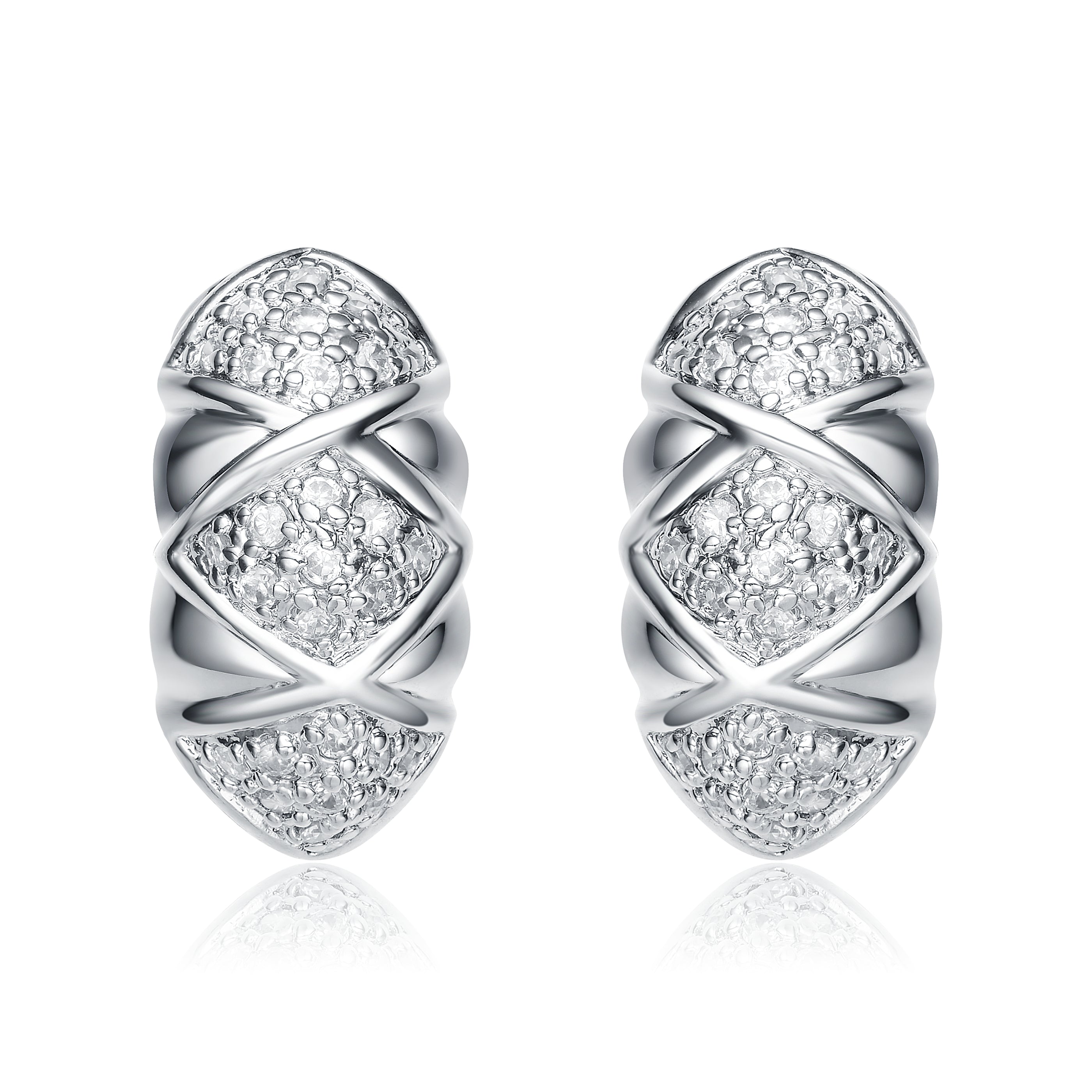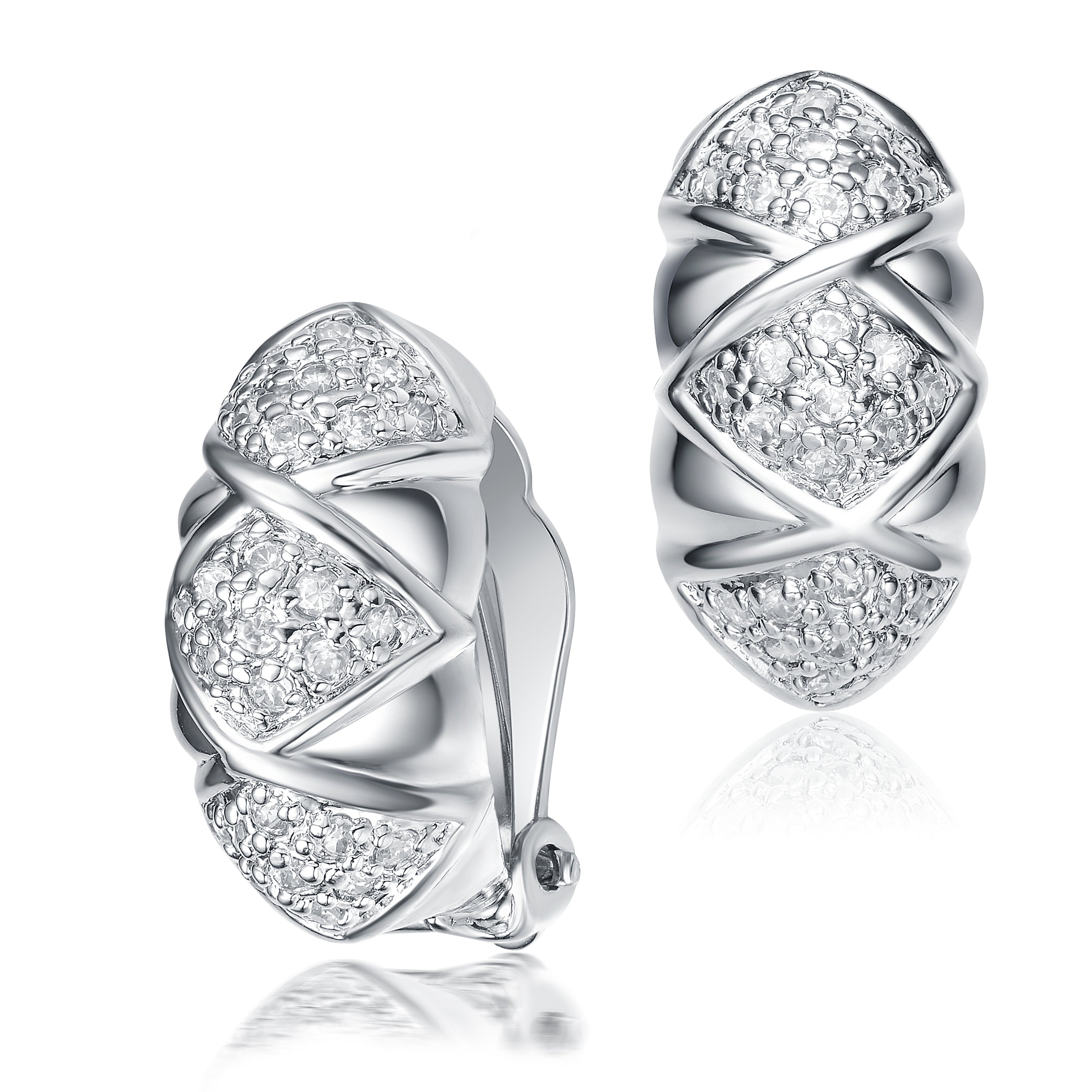 These are a pair of sterling silver earrings featuring a captivating infinity knot design. Each earring is adorned with multiple small, round-cut cubic zirconia stones that are pavé set to enhance their sparkle and mimic the brilliance of diamonds. The intricate knot pattern symbolizes eternity and adds a touch of sophistication, making these earrings an exquisite accessory for both formal and casual occasions. The high polish finish on the sterling silver further accentuates the luster of the cubic zirconias, offering an elegant shine that complements any outfit.