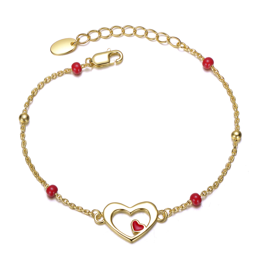 This charming bracelet features a sterling silver link chain with an alternating pattern of red and silver pearls In the ceneter, a silver open heart charm is elegantly accented by a small red heart nestled inside it. The bracelet is adjustable with a 5.5+1 inch extension, making it a perfect fit for growing wrists. This piece is a delightful addition to any kid's or teen's jewelry collection, adding a touch of love and elegance to their style.
