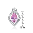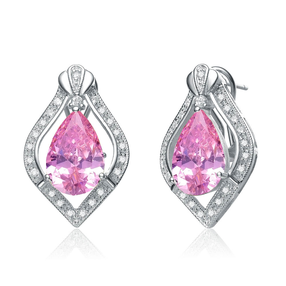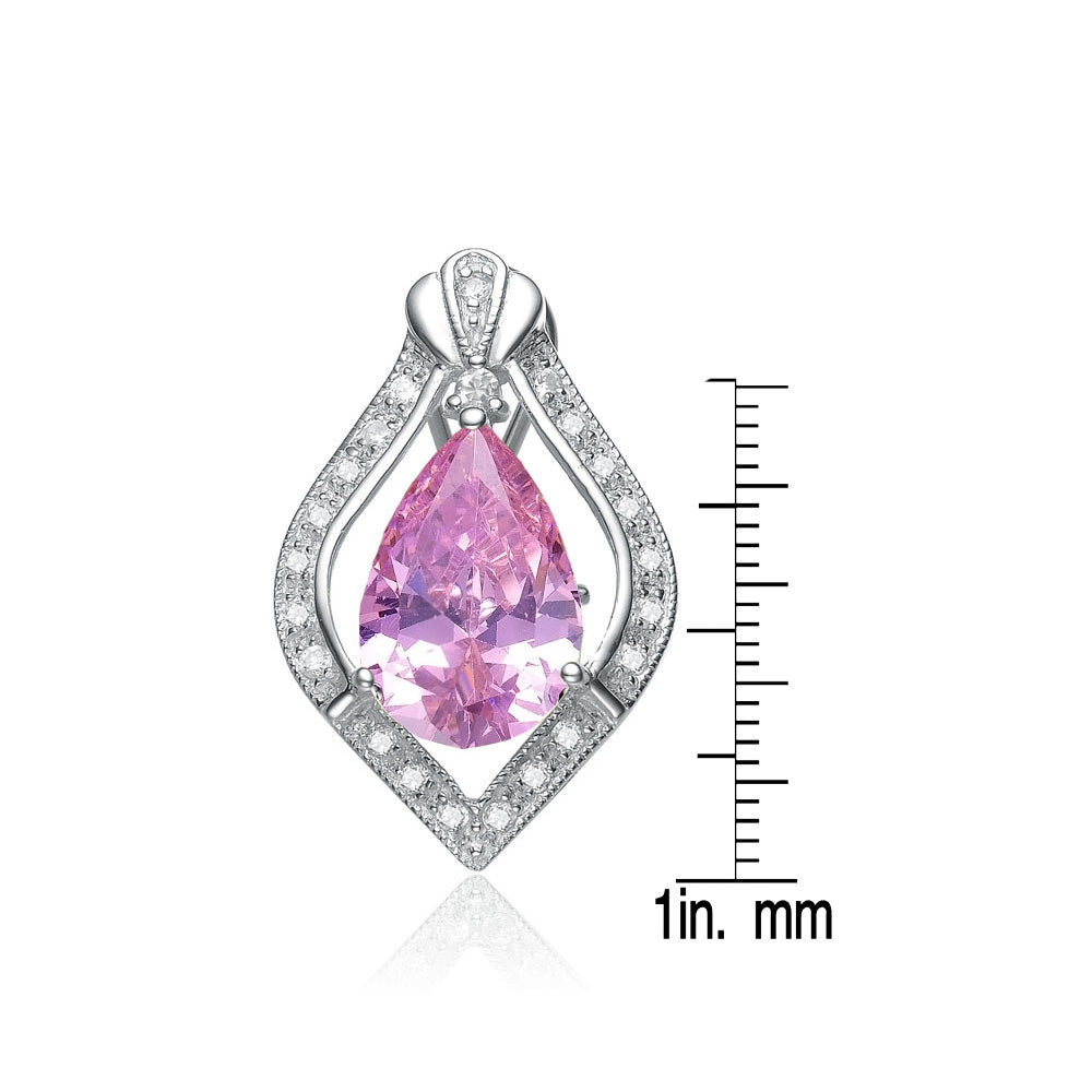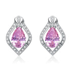 These earrings are a stunning pair of C.Z. Sterling Silver Rhodium Plated Peridot Pear Shape Earrings. The earrings feature a pear-shaped Pink stone in the center of a sterling silver setting. The stone is surrounded by small clear stones that add sparkle and contrast. The earrings are rhodium plated to enhance their shine and durability. The earrings have a post back closure for a comfortable and secure fit. These earrings are elegant and eye-catching, perfect for any occasion.