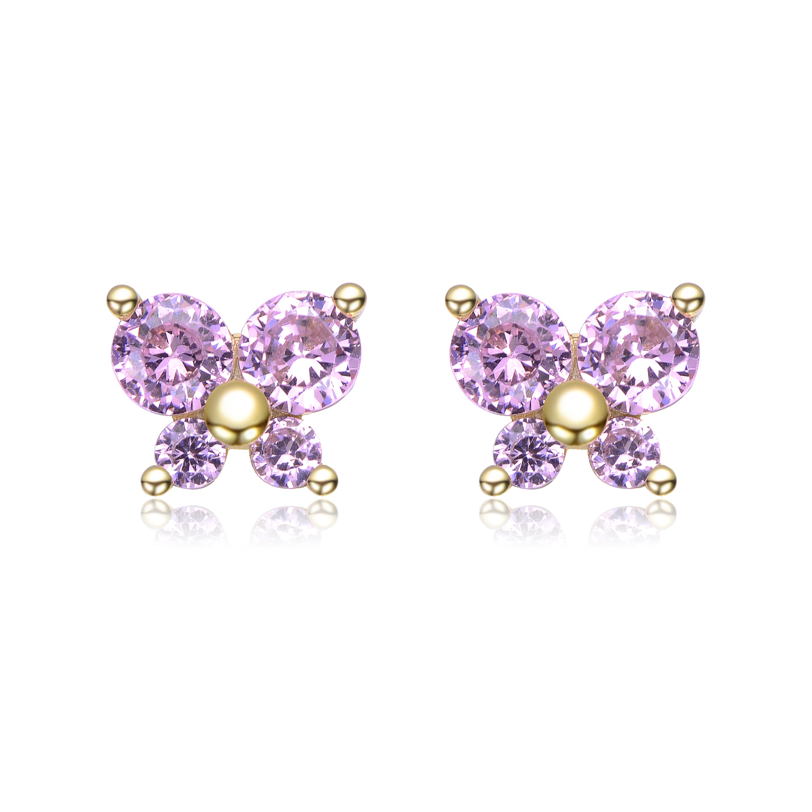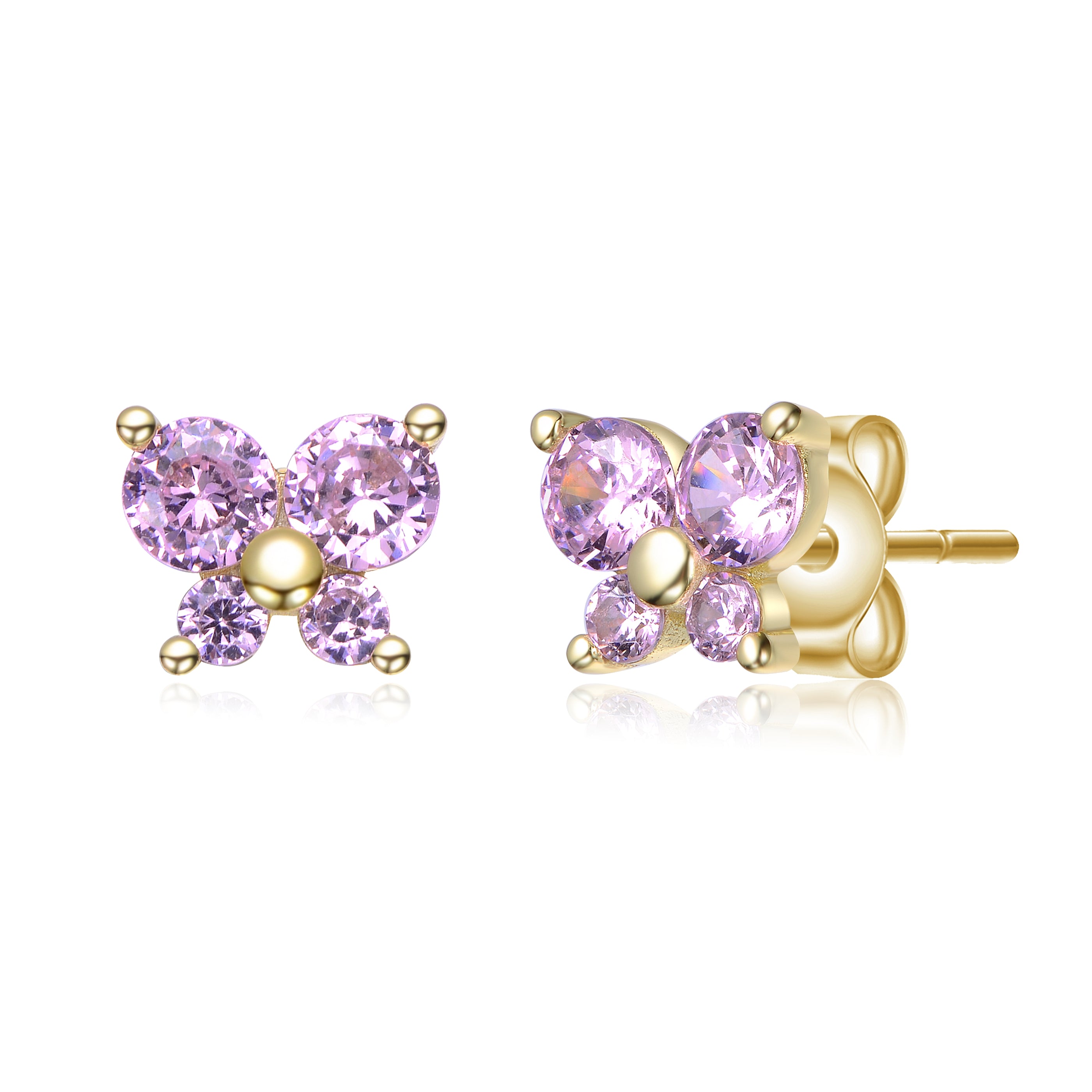 Pink Sterling Silver 14k Gold Plated Cubic Zirconia Four-Stone Butterfly Cluster Stud Earrings. A cluster of brilliance makes your day all the brighter! These exquisite 14k gold plated stud earrings feature four round brilliant cut pink cubic zirconias prong set in a glittering cluster shaped into an adorable butterfly. Butterflies symbolize happiness, love, and joy, adding meaning to these elegant little studs. Butterfly backs keep them secure, making them effortless to slip on and off the ears.