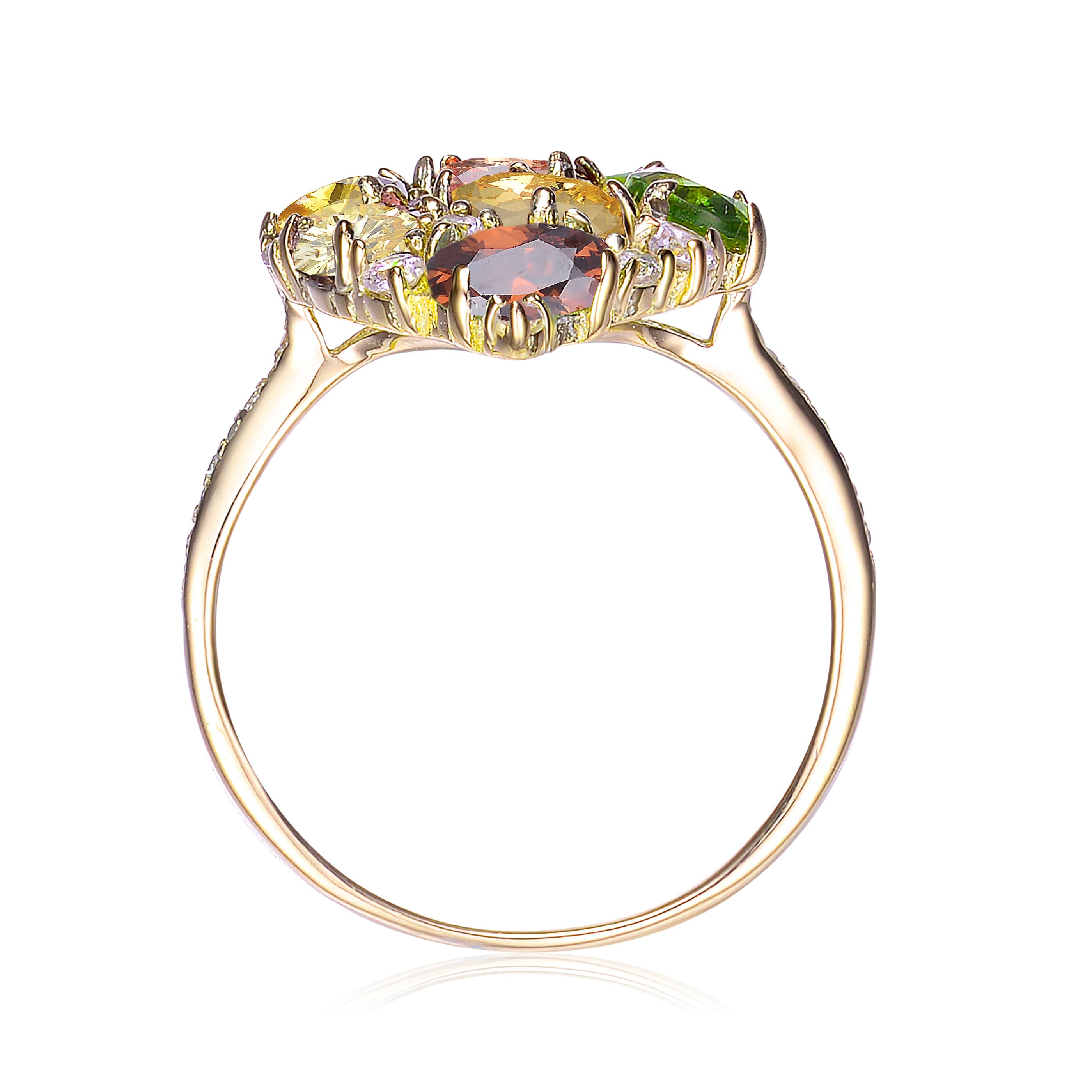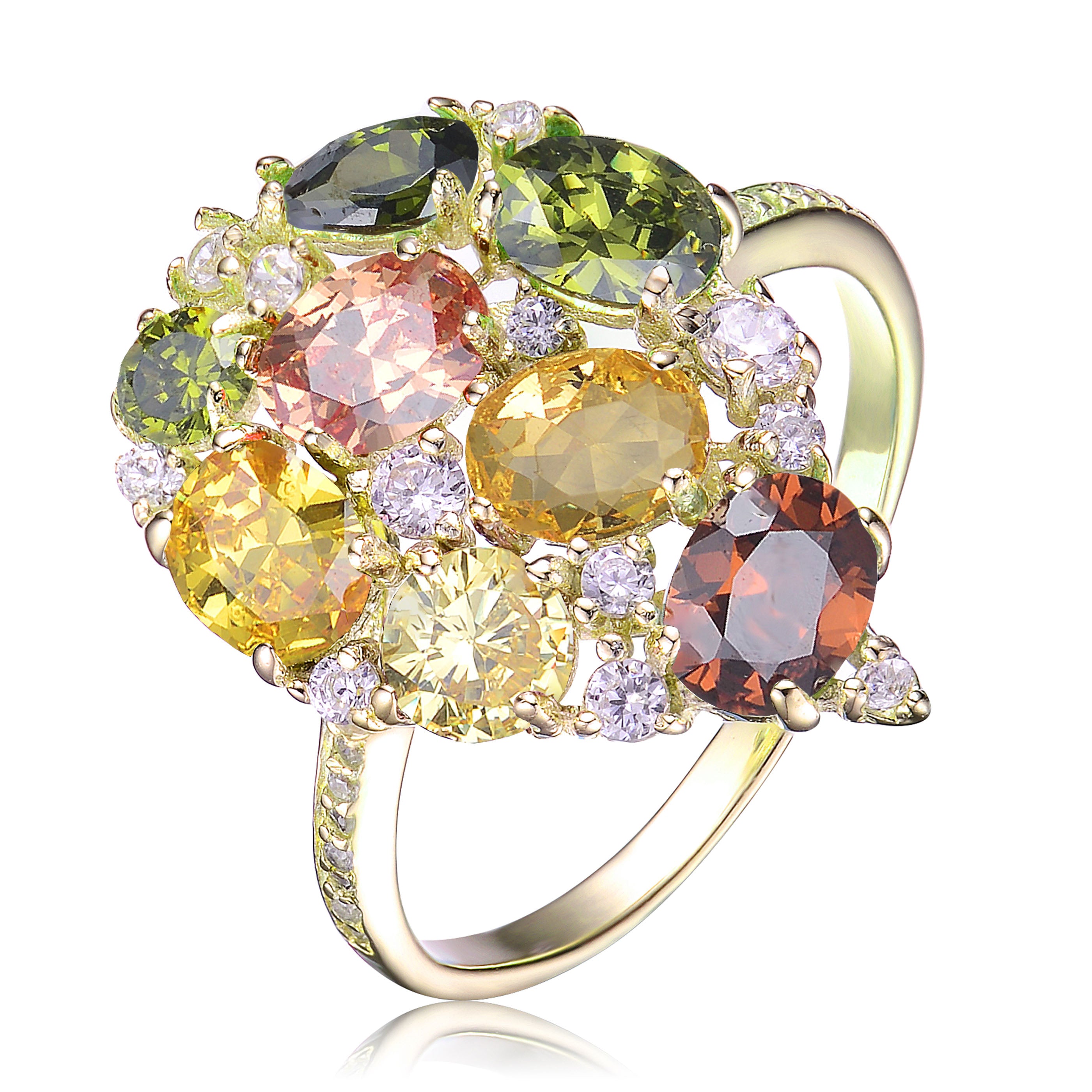 Add a touch of color to your fingers with this multi colored Cubic Zirconia ring. Dazzling large oval and round Cubic Zirconia in different colors are featured in this ring. Accentuated with a pave of clear round Cubic Zirconia inset in Sterling silver with 14K Gold plated band making this ring dazzle in every angle. This ring is available in sizes 6,7, and 8.