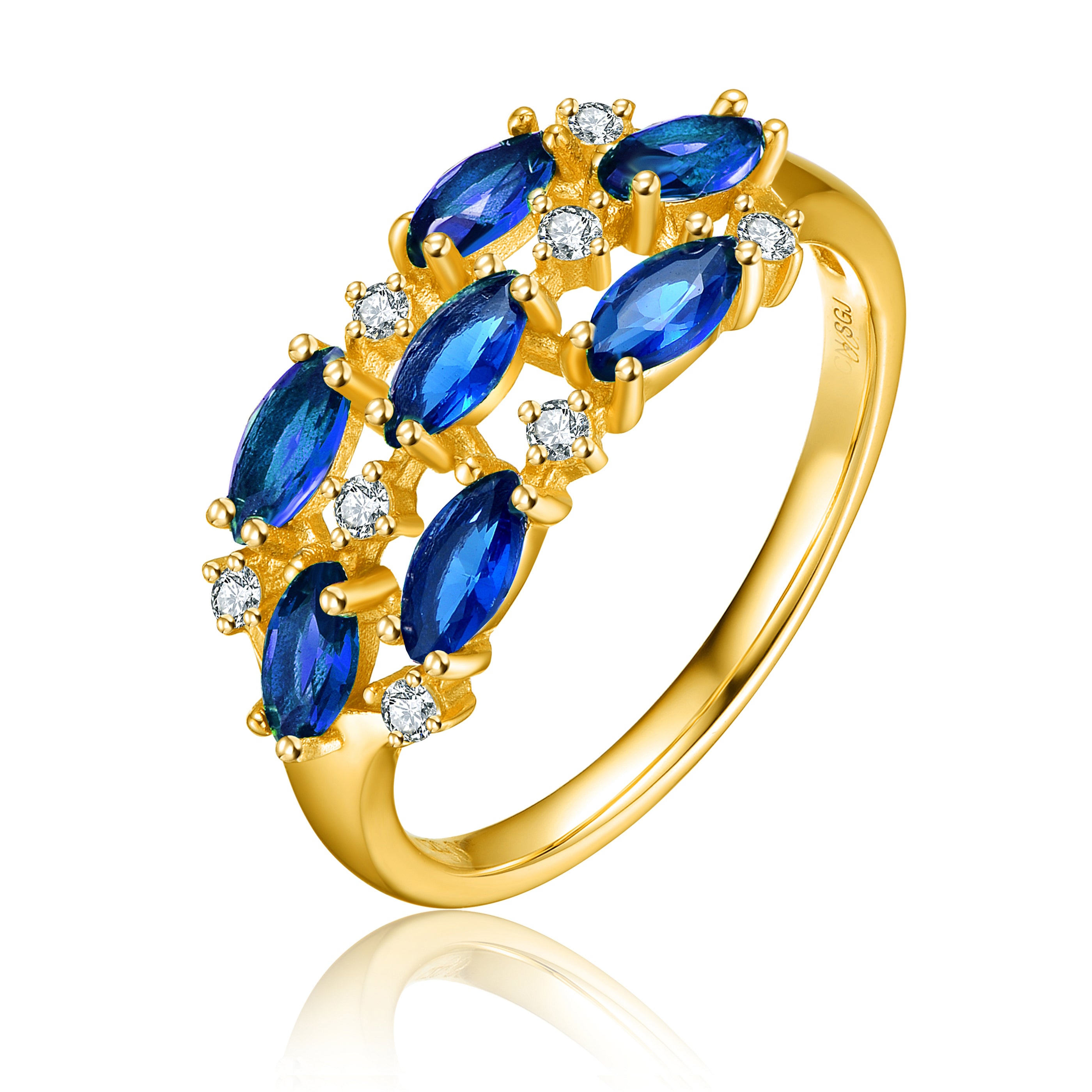 Stylish Sterling Silver with Gold Plated Marquise and Round Cubic Zirconia Coctail Ring. The design features marquise shaped gold plated base, accented with large colored marquise cubic zirconia stones set in prong and small clear round cubic zirconia stones also set in prong. The colored marquise stone and clear round stones are set consecutively, one colored marquise stone followed by one clear stone. Crafted of Sterling Silver with Gold plating and it is available with Sapphire Blue Marquise Cubic Zirconia Stone. It comes in sizes 6,7 or 8. Makes a great gift as well.