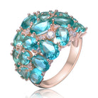 Classic paved design feature oval shaped aqua blue cubic zirconia with accents of small round cut clear gems beautifully paved in the setting. This paved ring is made from .925 sterling silver plated with rose gold with size 6,7 & 8 band.
