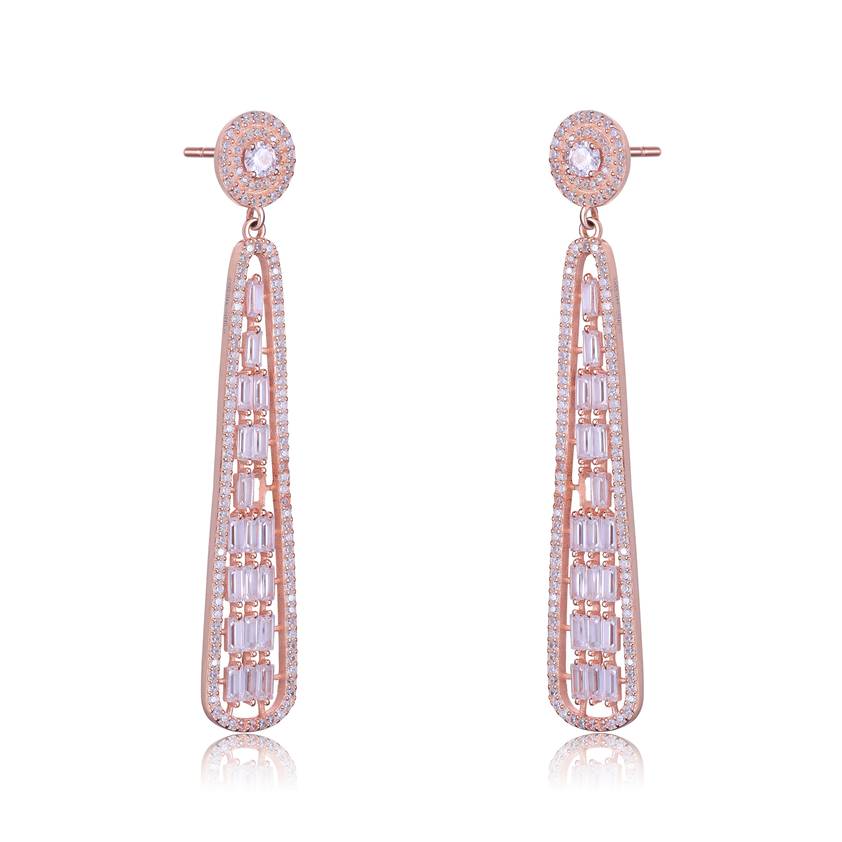 Features teardrop shaped base with clear cubic zirconia accent and a vertical ladder bar with size variant gemstones on the middle. This pendant necklace is made from .925 sterling silver plated with rose gold comes with a chain secured by spring ring.