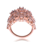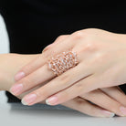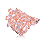 Fine design featuring morganite cubic zirconia gemstones pronged beautifully in the middle of the wide base. This wide ring is made from .925 sterling silver plated with rose gold that compliments its unique style.