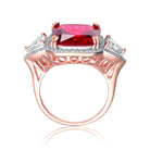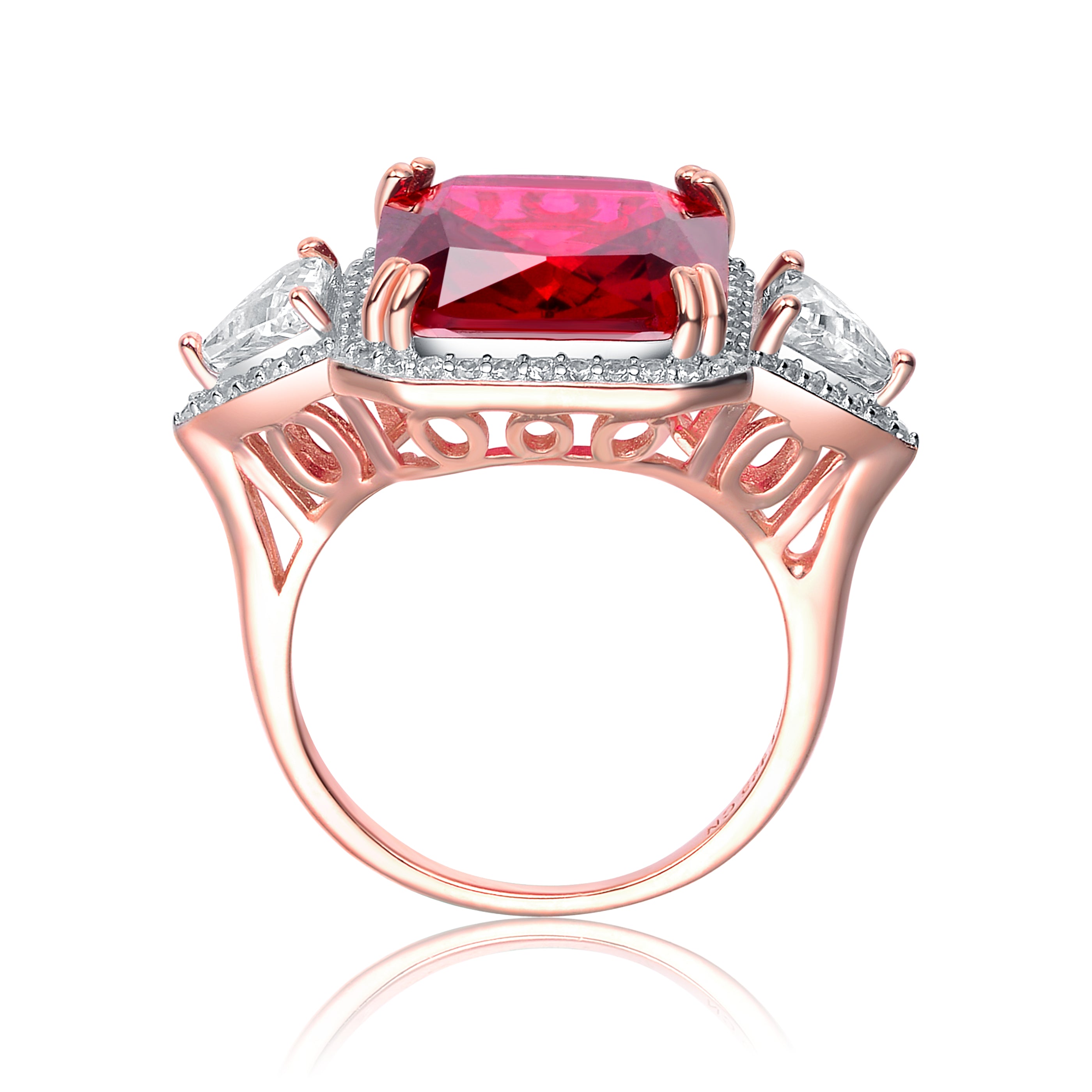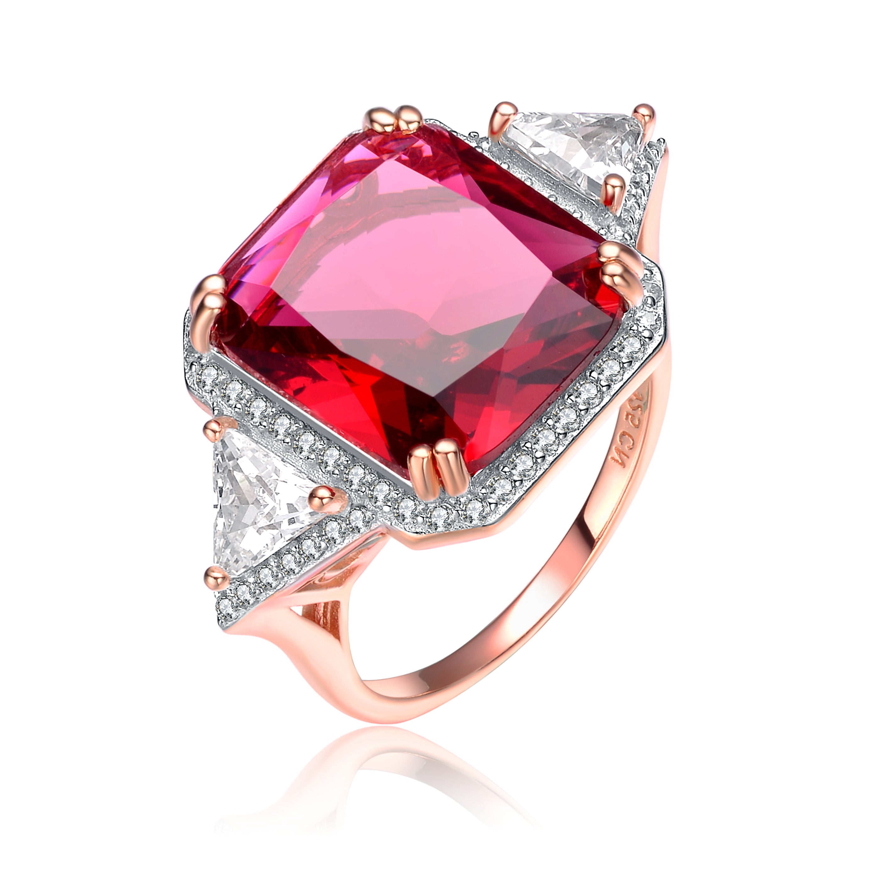 Features a large square cut red cubic zirconia in the center with small clear gems paved around it and clear triangle cut cubic zirconia pronged beside it. This three-gemsone ring is made from .925 sterling silver plated with rose gold with size 6,7 band.