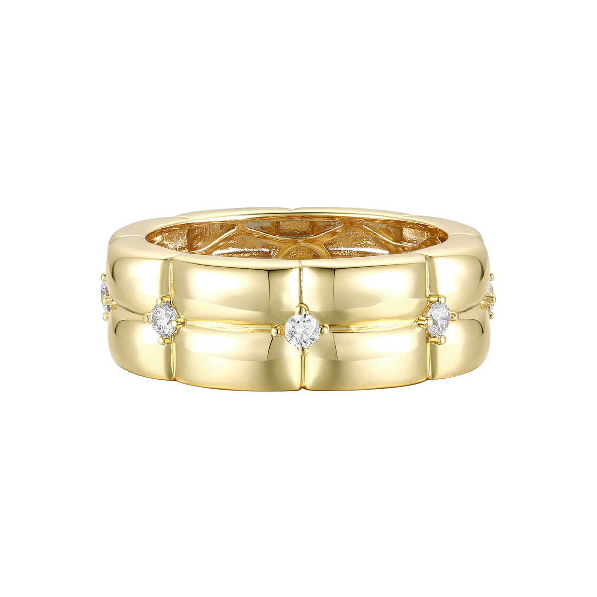 Make a chic statement in trendy style with this textured band ring, perfect for stacking or wearing solo with its lightweight dome-shaped design. Sparkling round brilliant cut cubic zirconia's sit nestled in a bright shine double weave pattern beautifully crafted in 14k yellow gold plated sterling silver. Available in ring sizes 6,7,8.