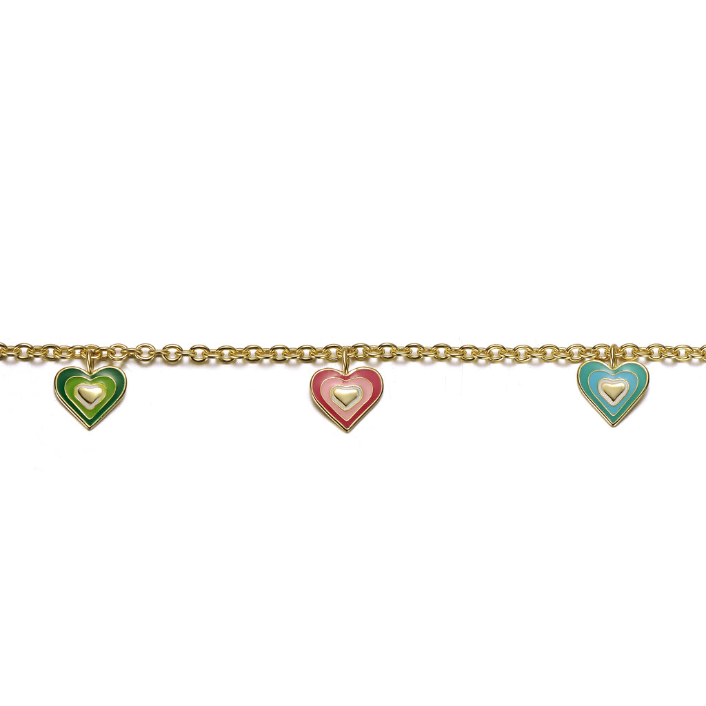 Perfect for every day and all year-round, this sterling silver adjustable bracelet, plated in 14K gold, is an exquisite gift for any loved one. It features three charming 8mm heart charms, adorned with layers of vibrant blue, green and pink enamel, highlighted by golden hearts at their centers. The bracelet's shiny cable chain and lobster clasp, along with an adjustable extension chain, ensure a perfect fit for different wrist sizes. Measuring 5.5"+1", this beautifully crafted piece is ideal for those who cherish special occasion jewelry and elegant wristwear. Whether for Holiday's Day or daily wear, this multi-color enamel halo heart charm bracelet exemplifies premium quality and contemporary design, making it the perfect gift for your loved one.