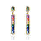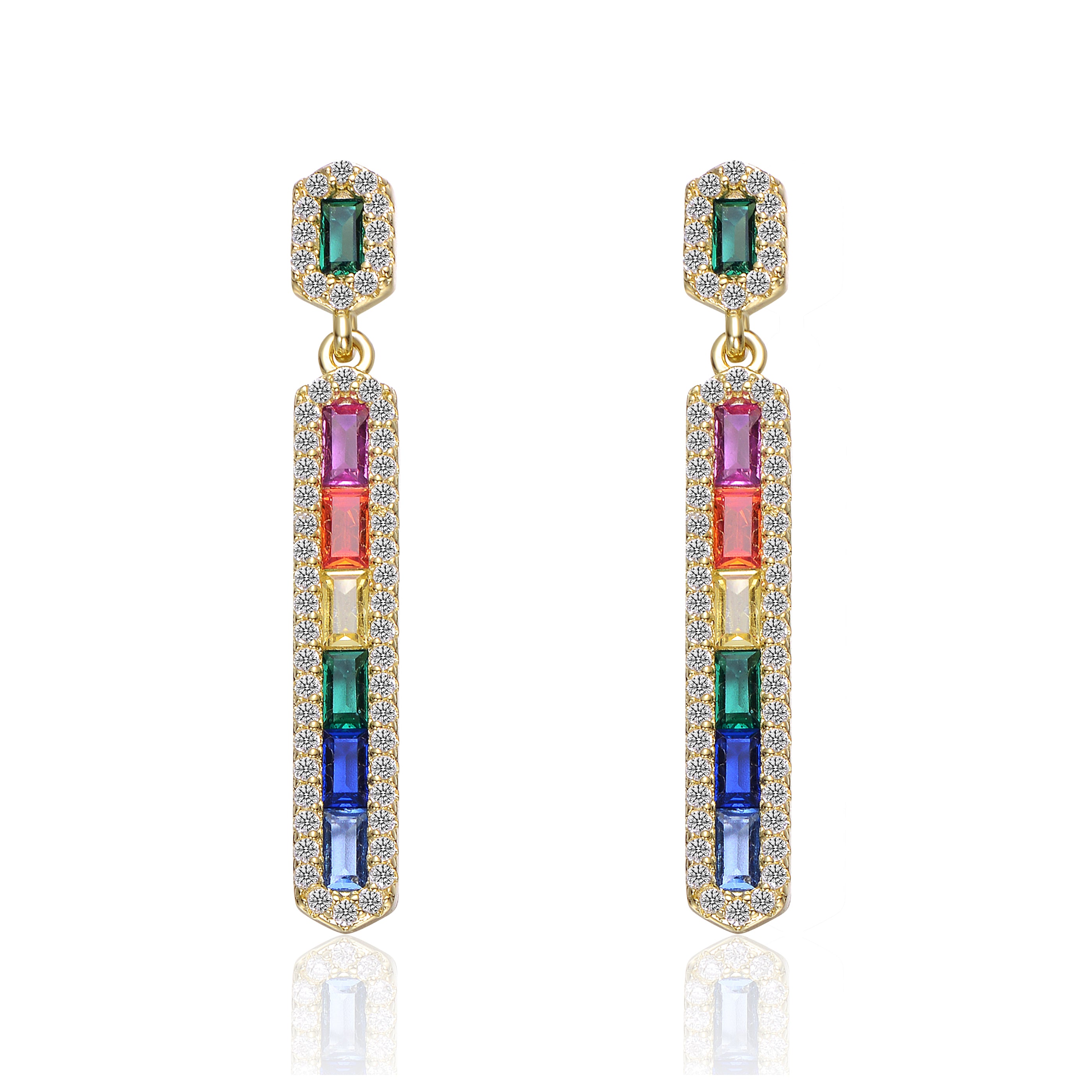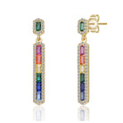 Sterling Silver 14k Gold Plated Rainbow & White Cubic Zirconia Linear Dangle Earrings. A rainbow of limitless style with these brightly polished sterling silver dangle earrings make all your days and nights glamorous. A vibrant display of emerald cut cubic zirconia highlight the face and eyes, with each stone invisibly channel set in the middle. Sparkling round brilliant cut cubic zirconia pave set around them give these drop earrings pure elegance. Butterfly backs keep them secure.