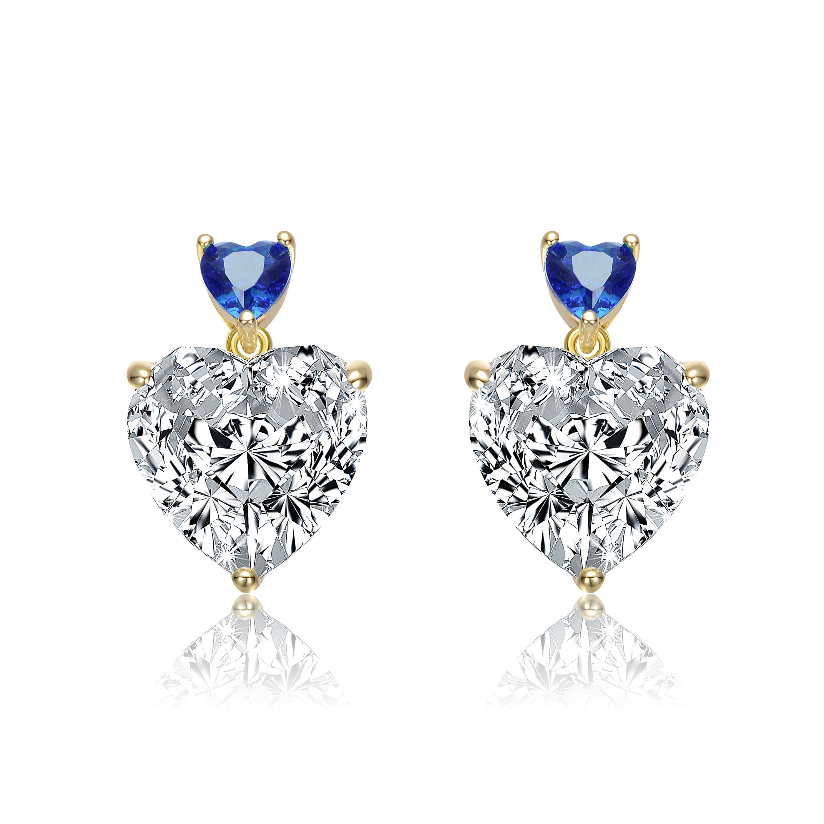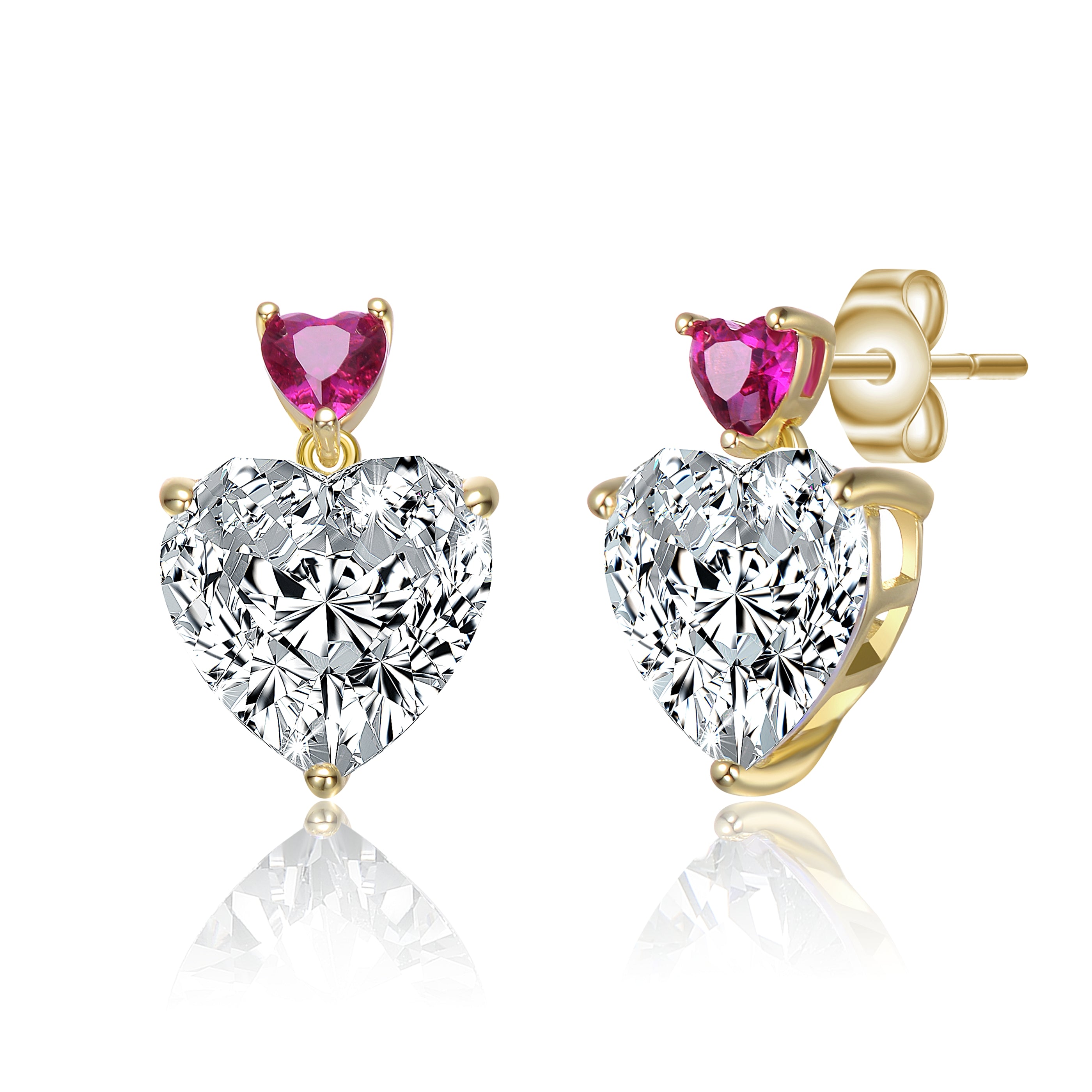 Sterling Silver 14k Gold Plated with Colored Cubic Zirconia Two-Stone Heart Dangle Earrings. These glamorous sterling silver 14k gold plated two-stone earrings feature heart-shaped white and blue or red cubic zirconia, giving them added romance with an air of enchantment as they glisten on the earlobes. Butterfly backs keep these studs secure, making them effortless for placing on and off the ears as they complement any wardrobe. Take your look to another level of understated elegance.