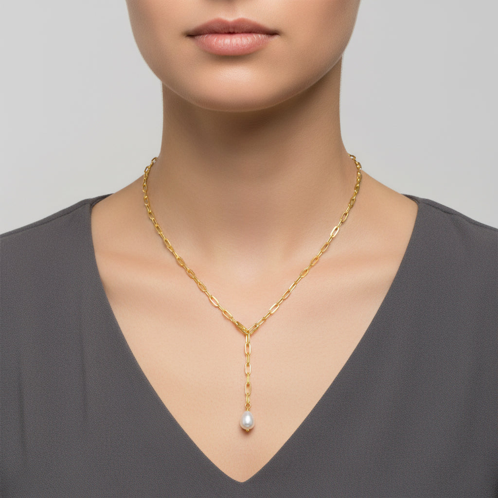 This elegant necklace features a sterling silver chain in 14K Gold Plated. forming a distinctive Y-shape. At the center of the Y, a white egg-shaped freshwater pearl is delicately suspended, adding a touch of sophistication and timeless beauty. The gold plating enhances the necklace's luxurious appeal, making it a perfect accessory for both casual and formal occasions. The combination of precious metals and a natural pearl creates a harmonious and eye-catching piece of jewelry.