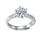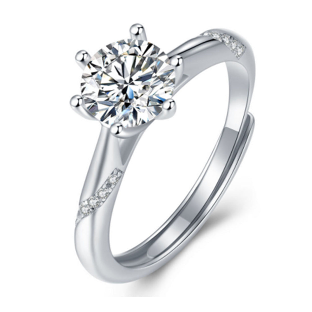 Sterling Silver 1ct Lab-Grown Moissanite Ribbon Pave Engagement Ring. Select this sterling silver engagement ring for its unique yet classic style. A sparkling round brilliant cut lab-grown moissanite secured in a six-prong setting takes center stage, set high above a round band with ribbons of round brilliant cut lab-grown moissanite accent stones. Mix and match this engagement ring with the wedding band of your choice, creating an elegant wedding set all your own. Ring is adjustable in size, accommodating different ring sizes.