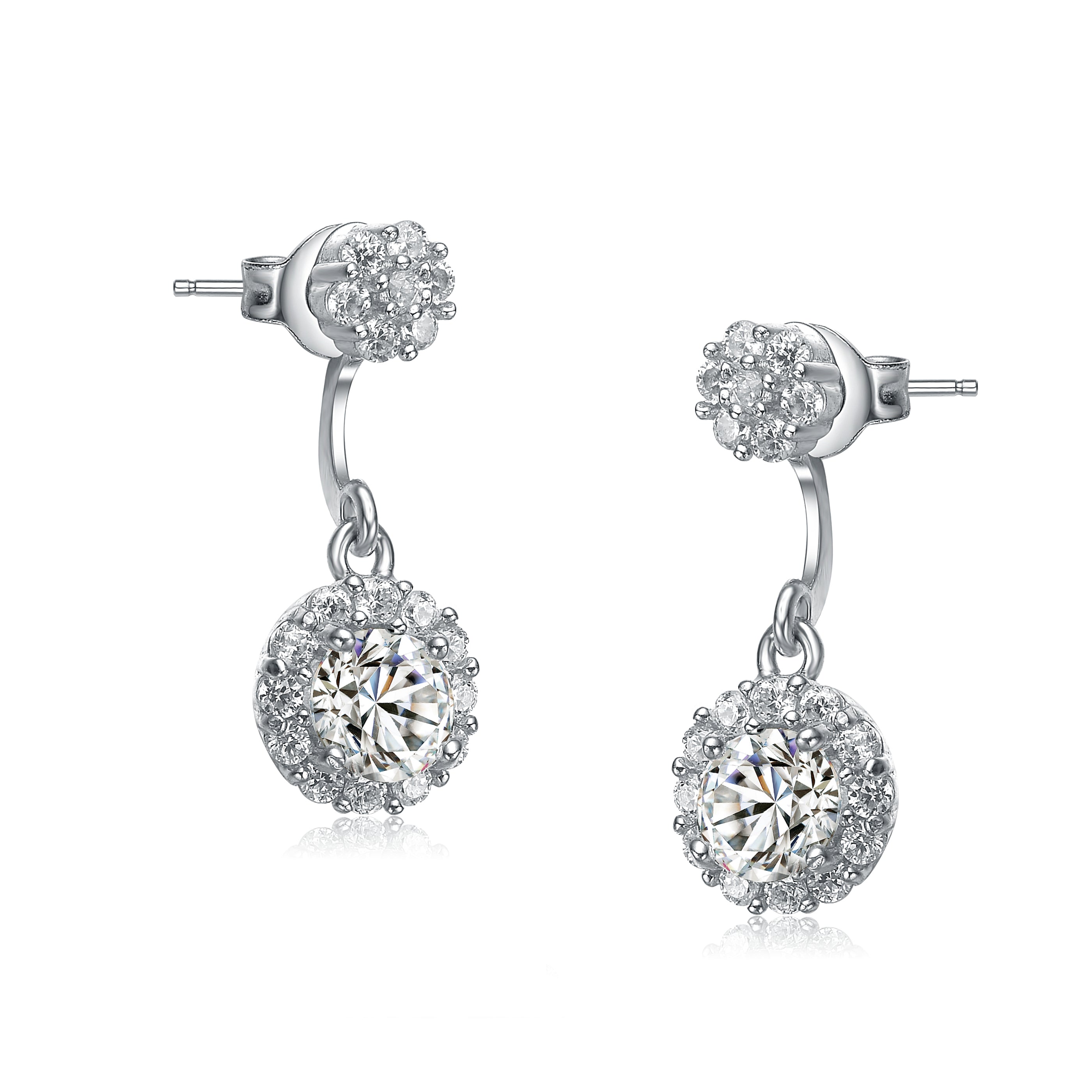 A cutting edge approach is taken when it comes to this sterling silver earring. It uses a curved piece as a bridge from the post of cubic zirconias to the dangling cubic zirconia stone.