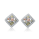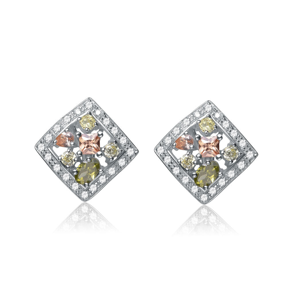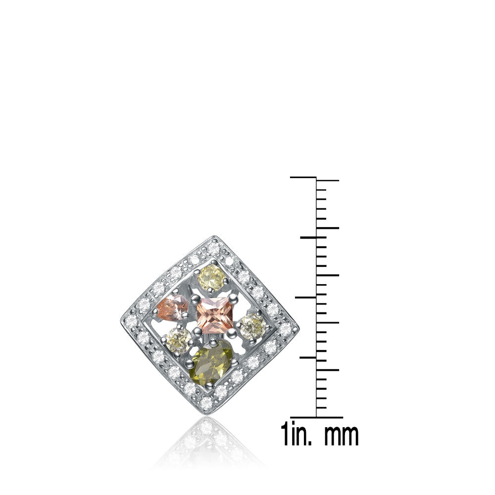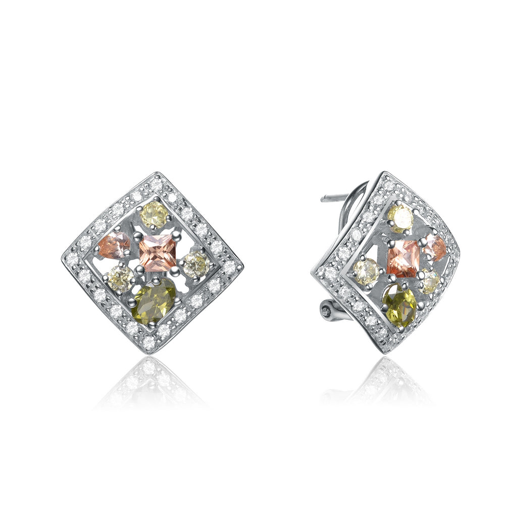 A shaped frame of clear cubic zirconias encloses pink and green cubic zirconia flowers. This is a delightful set of earrings for a nature enthusiast.
